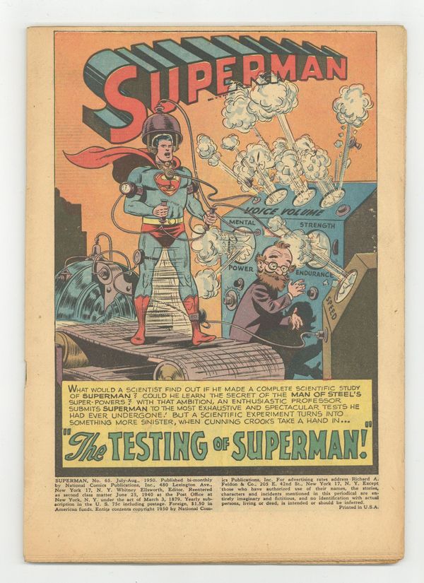 Cover art by Al Plastino. The Testing of Superman, pencils by Wayne Boring, inks by Stan Kaye; As a reward for saving Lois's life, Superman lets Dr. Potts perform a complete set of scientific tests on his powers. Superman's Sweetheart, script by William Woolfolk, pencils by Al Plastino, inks by Stan Kaye; Lois gets jealous when Superman seems to be paying more attention to Peggy, her roommate. Balance Your Fun Diet public service announcement starring Buzzy, script by Jack Schiff, art by Win Mortimer. Shorty humor page by Henry Boltinoff. Three Supermen from Krypton!, script by William Woolfolk, art by Al Plastino; Superman meets three Kryptonian brothers who were convicted and sentenced by Krypton's Ruling Council to a sentence of suspended animation adrift in space; The first appearance of other survivors of Krypton. Peg humor page by Henry Boltinoff. 52 Pages, Full Color. Cover price $0.10. Grade: Coverless explanation of grade Condition: Used (collectible)