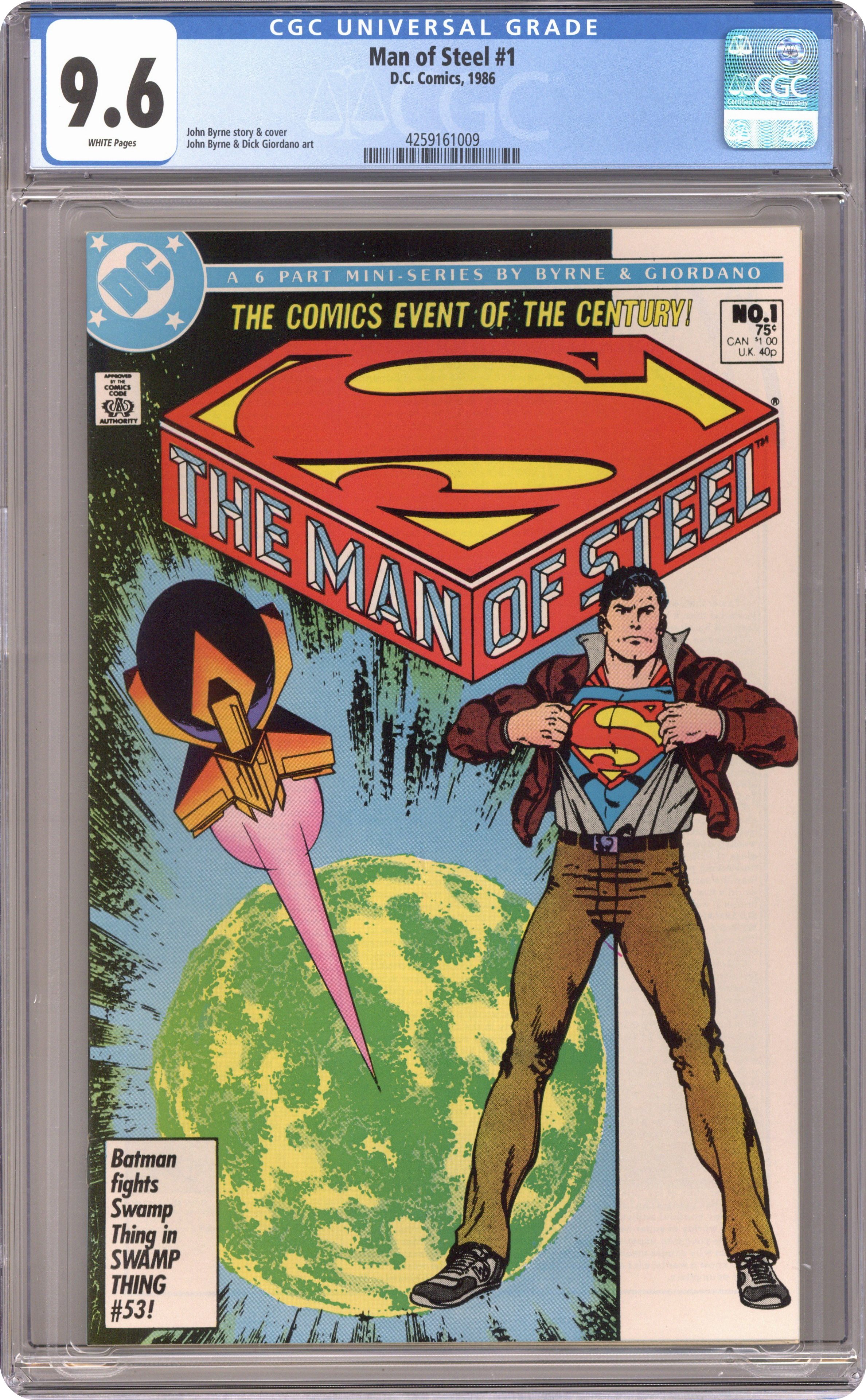 Standard Direct Edition. Published just a few months after Crisis on Infinite Earths, John Byrne's The Man of Steel updated the saga of Superman for modern audiences. His origin was altered, as were many other aspects of the character. This first issue reveals that Kal-El was conceived via the mingling of seeds in a matrix chamber, Clark's powers developed slowly over time (meaning Superboy was written out of continuity), and Superman's body projected an aura that protected his now vulnerable costume. Written and drawn by John Byrne, with inks by Dick Giordano. Cover price $0.75. Grade: CGC 9.6 explanation of grade Condition: Used (collectible)