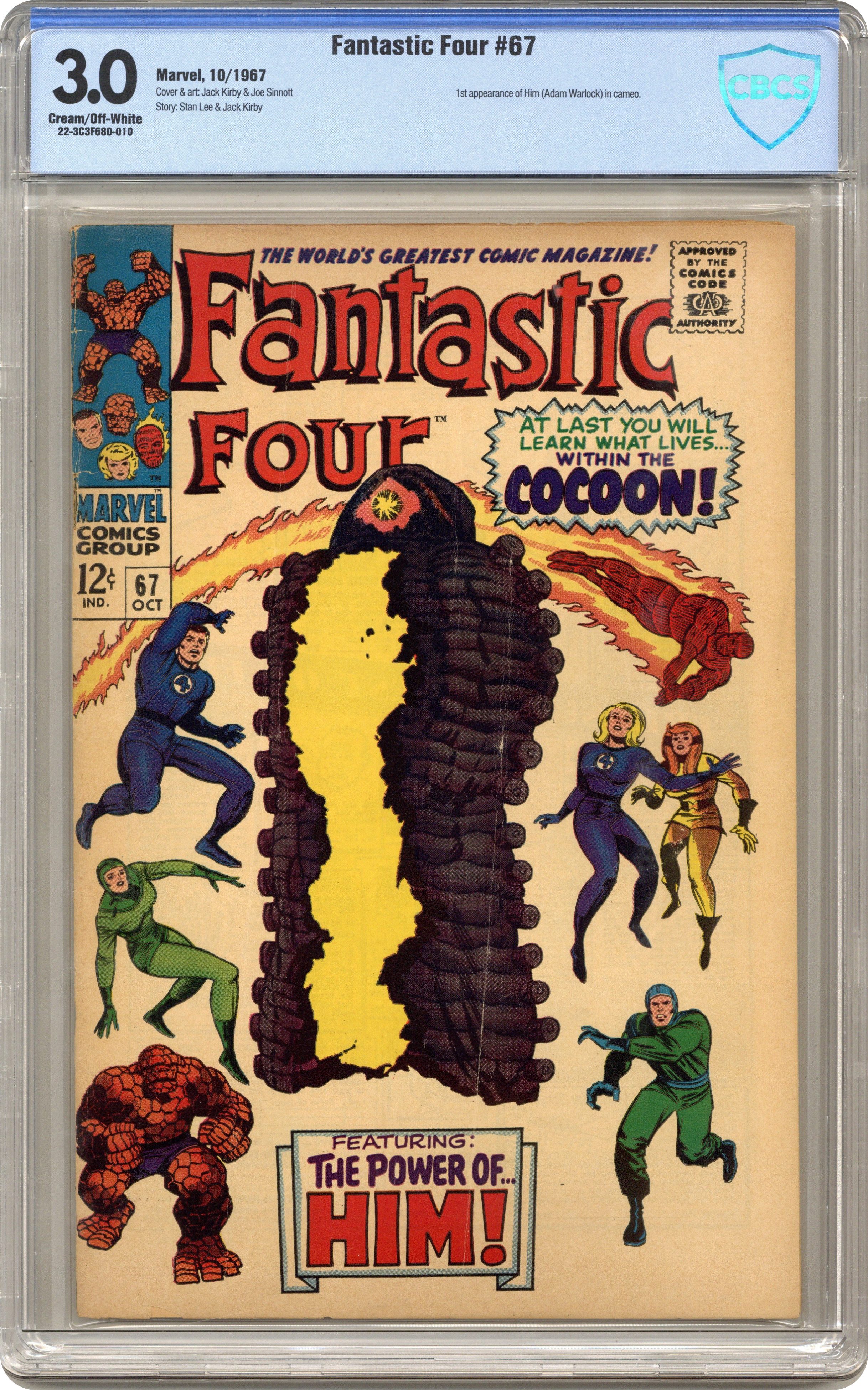 Ended Sep 29 2023 Winning Bid $55 1st printing. Cover pencils by Jack Kirby, inks by Joe Sinnott. Origin (part 2) and first appearance of Him (Warlock) in "When Opens the Cocoon!", script by Stan Lee and Jack Kirby (co-plot), pencils by Jack Kirby, inks by Joe Sinnott; The FF track the kidnapped Alicia to the Beehive, where the cocoon opens and reveals Him. Crystal (of the Inhumans) appearance. 36 pgs. $0.12. NOTE: 1994 JC Penney reprint exists. Can be identified by having a Stridex ad on the back cover. Cover price $0.12. Grade: CBCS 3.0 explanation of grade Condition: Used (collectible)