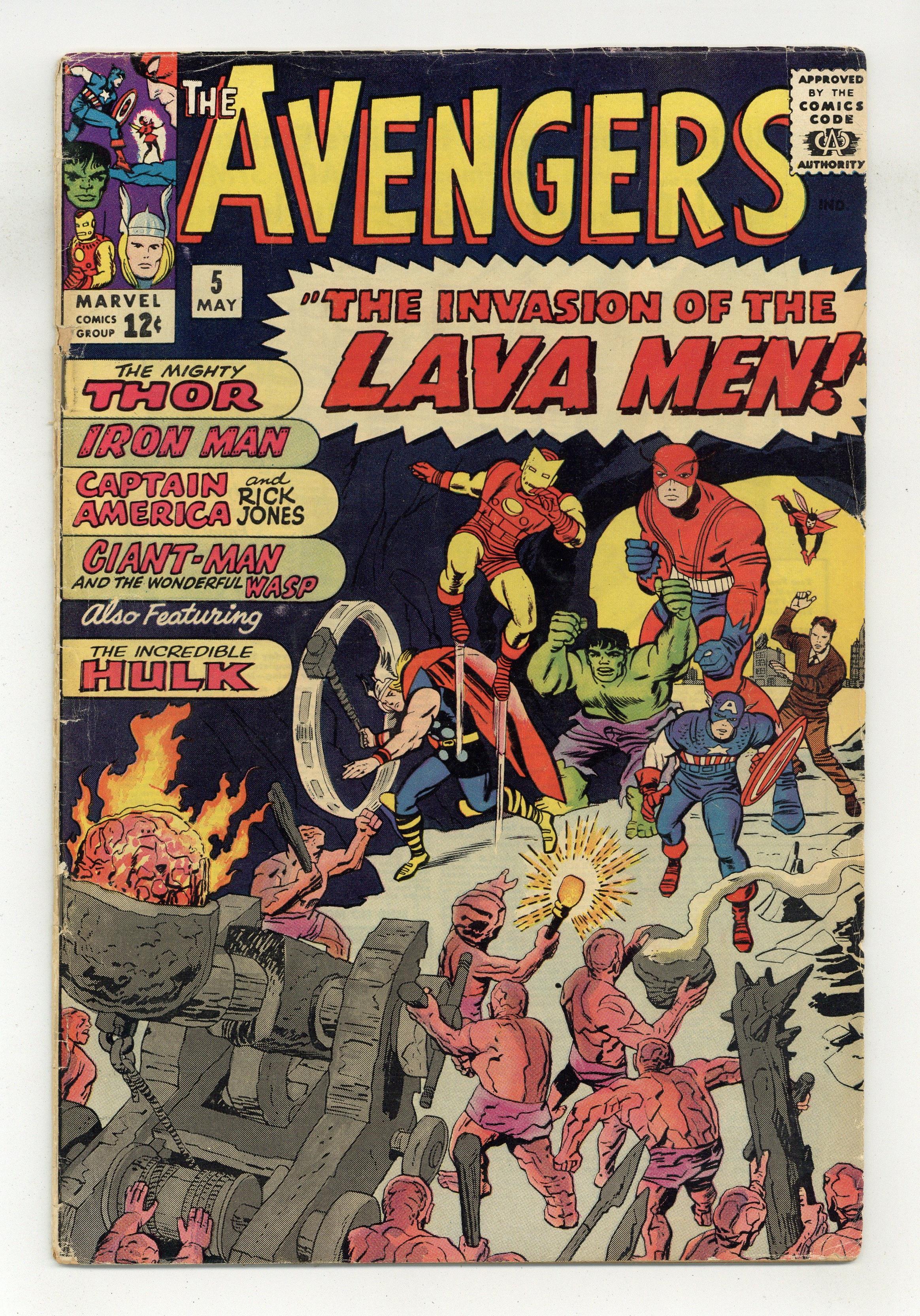 Cover pencils by Jack Kirby, inks by Vince Colletta. "The Invasion of the Lava Men!", script by Stan Lee, pencils by Jack Kirby, inks by Paul Reinman; The Avengers return to their mansion to inspect the damage caused by the battle with the Hulk; Days later, a mysterious high-pitched sound destroys a computer in one of Tony Stark's factories in Long Island and Iron Man is informed; Meanwhile, Giant-Man and the Wasp are conducting experiments inside of a large anthill; They are also affected by the noise and manage to escape before the anthill collapses; In his medical office, Don Blake reads about the effects of the noise in the newspaper; Thor meets up with Captain America and Rick Jones, who are training, and they witness another shockwave; The six heroes investigate the source of this new unknown threat; Meanwhile, in an army base in the west of the country, a strange rock breaks the surface of the earth, and soldiers investigate. Roster includes: Captain America, Thor, Iron Man, Wasp, and Giant-Man. Appearance by the Hulk. First letters page; letter to the editor from comics artist Alan Weiss. 36 pgs., full color. $0.12. Cover price $0.12. Grade: GD/VG 3.0 explanation of grade Condition: Used (collectible)