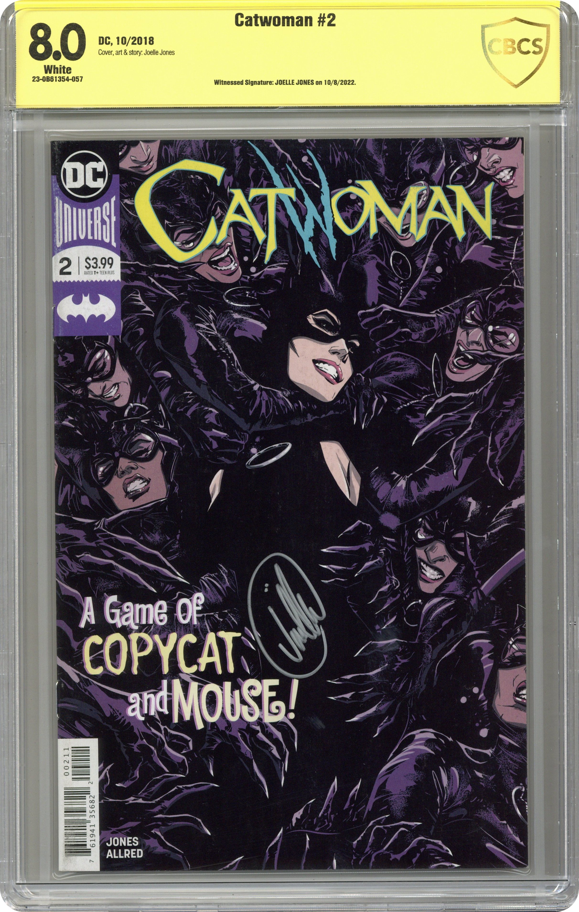 Copycats: Part 2 - Written by Joelle Jones. Art and Cover by Joƫlle Jones and Laura Allred. Gotham's a toxic litter box for Selina Kyle of late, so she hits the road looking to clear the air, change her look and clear her name, too-there's a copycat burglar swiping her M.O. who needs sorting out. In her hometown, Catwoman runs afoul of a crime boss who's also hunting this impostor. Can the two declare a truce to hunt a mutual enemy, or will Selina end up just more roadkill? 32 pages, full color. Rated T+ Cover price $3.99. Grade: CBCS 8.0 explanation of grade Condition: Used (collectible)