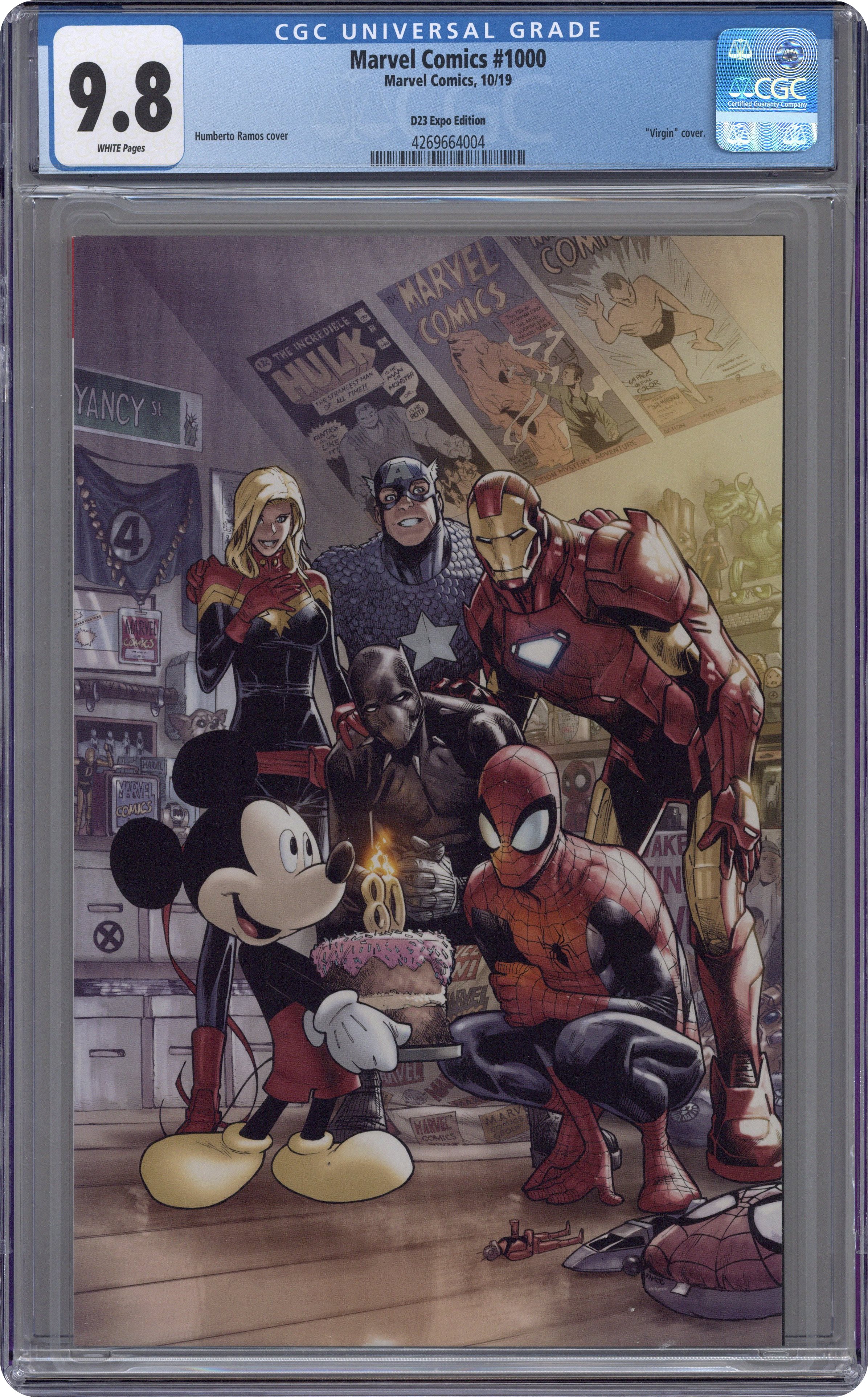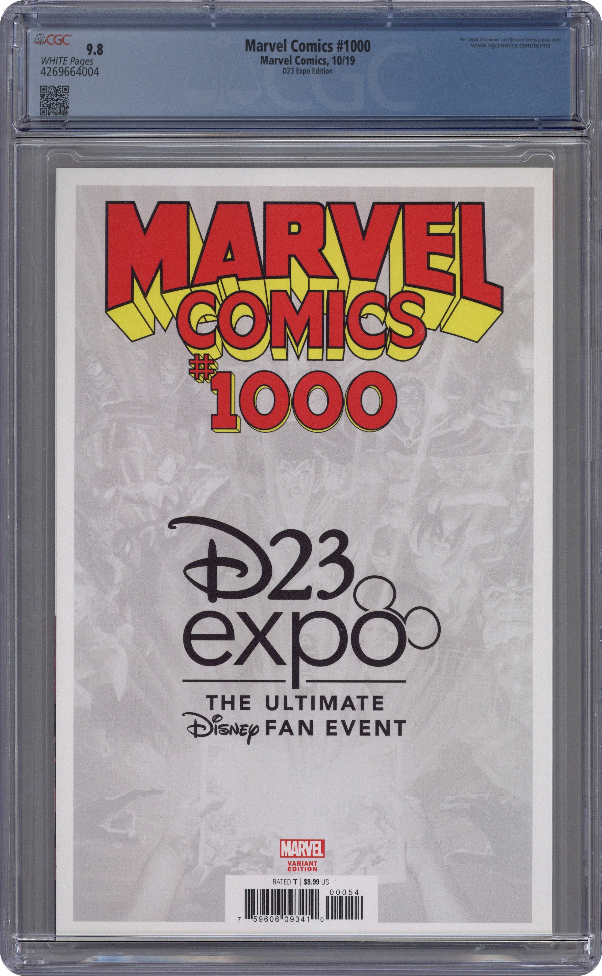 D23 exclusive variant by Humberto Ramos. THE GREATEST TALENT EVER ASSEMBLED FOR ONE STORY! THIS IS THE BIG ONE! In celebration of Marvel's 80th Anniversary, we have gathered together the greatest array of talent ever to be assembled between the covers of a single comic book! Names from the past, from the present, and even the future! Every page is filled with all-new work from this cavalcade of comic book luminaries! There is a mystery that threads throughout the Marvel Universe - one that has its origins in MARVEL COMICS #1 and which unites a disparate array of heroes and villains throughout the decades! What is the Eternity Mask, and who is responsible for the conspiracy to keep it hidden? And what new player will make their startling debut as these secrets are peeled away? Featuring the entirety of the Marvel Universe of characters! Written by Al Ewing, Jeremy Whitley, Mark Waid, Kathryn Immonen, Kurt Busiek, Joe Hill, Kieron Gillen, Jeph Loeb, Alex Ross, James M. Iglehart, Saladin Ahmed, Phil Lord, Christopher Miller, Walter Simonson, Gerry Duggan, Jonathan Lethem, Everett Lethem, Desmond Lethem, Priest, Kelly Sue DeConnick, Ryan North, Ralph Macchio, Jimmy "Taboo" Gomez, Benjamin Jackendoff, Jim Zub, Gerry Conway, Roy Thomas, Matthew Rosenberg, Charles Soule, Toby Whithouse, Rainbow Rowell, Donald Mustard, David Mandel, Eve L. Ewing, Brad Meltzer, Tom DeFalco, Glen David Gold, Ed Brisson, Adam F. Goldberg, Rob Liefeld, Erik Larsen, Jason Aaron, Donny Cates, Jonathan Hickman, Patrick Gleason, Gail Simone, Joe Quesada, Peter David, Chris Claremont, Kareem Abdul-Jabbar, Raymond Obstfeld, Kelly Thompson, Tini Howard, Tom Taylor, Allan Heinberg, David F. Walker, Greg Pak, Chip Zdarsky, J. Scott Campbell, Jason Reynolds, Dan Slott, Jeff Lemire, Neil Gaiman, Jason Latour, Derek Landy and J. Michael Straczynski. Art by Steve Epting, Patch Zircher, Leonardo Romero, Joshua Cassara, Irene Koh, John Cassaday, Stuart Immonen, Ron Garney, Leonard Kirk, Phil Noto, Cameron Stewart, Gabriel Hardman, Michael Allred, Doug Braithwaite, Tim Sale, Cory Smith, Chris Weston, Eduardo Risso, CAFU, Klaus Janson, Alex Ross, Oscar Martin, Steve Rude, Javier Rodriguez, Alvaro Lopez, Walter Simonson, Chris Samnee, Paul Hornschemeier, Brian Stelfreeze, Joe Bennett, Ruy Jose, David Lopez, James Harren, Marco Checchetto, Jeffrey Veregge, Nick Bradshaw, Greg Land, Jay Leisten, Rod Reis, Leinil Francis Yu, George Perez, Terry Dodson, Rachel Dodson, Carlos Pacheco, Rafael Fonteriz, Alan Davis, Kris Anka, Donald Mustard, Butch Guice, Jen Bartel, Julian Totino Tedesco, Ron Frenz, Brett Breeding, Chris Mooneyham, Mark Bright, Scott Hanna, Jorge Fornes, Adam Riches, Daniel Acuna, Rob Liefeld, Erik Larsen, Goran Parlov, Geoff Shaw, Dustin Weaver, Patrick Gleason, David Baldeon, Joe Quesada, Kevin Nowlan, Adam Kubert, Salvador Larroca, Mattia De Iulis, Pepe Larraz, Kia Asamiya, Juann Cabal, Jim Cheung, JJ Kirby, Takeshi Miyazawa, Chip Zdarsky, Jesus Saiz, J. Scott Campbell, Patrick O'Keefe, Marcos Martin, Jeff Lemire, Mark Buckingham, Jason Latour, Paco Medina, Ed McGuinness, Mark Morales, Steve McNiven, Christian Ward, Mike Deodato, Jr. and Paul Azaceta. 96 pages. full color. Rated T Cover price $9.99. Grade: CGC 9.8 explanation of grade Condition: Used (collectible)