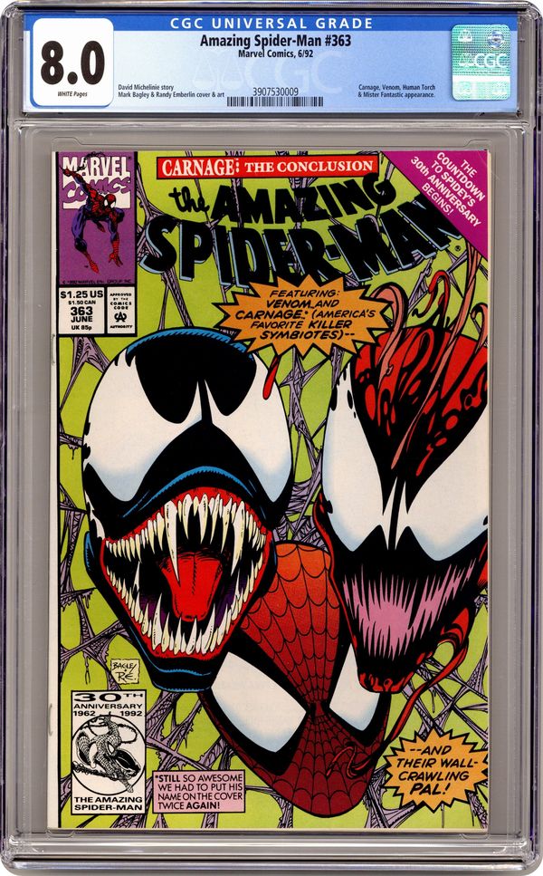 Ended Feb 23 2024 Winning Bid $25 Direct Edition. "Savage Grace!" Part 3 of 3. Script by David Michelinie. Pencils by Mark Bagley. Inks by Randy Emberlin. Cover by Mark Bagley and Randy Emberlin. Carnage takes J. Jonah Jameson hostage and drags him to a heavy metal concert at Madison Square Garden! The psychotic killer plans to execute JJJ in front of thousands of headbangers! But before Carnage can deliver the deathblow, Spider-Man and Venom strike! The ferocious fight leads into the subway tunnels and then back onto the concert stage! Where thanks to MSG's awesome sound system, the web-slinger tries to knock out both Carnage and Venom! The wall-crawler's ploy better work, because double-crossing Venom could have lethal consequences! A fantastic finish! First appearances of the Richard Parker and Mary Parker life model decoys (LMD's). Cameo appearances by Joe Robertson, Mr. Fantastic, and the Human Torch. (Notes: Venom appears next in the one-shot: Spider-Man Special Edition -- The Trial of Venom (1992). Carnage returns in the first issue of Spider-Man Unlimited (1993 1st series) to kick off the Maximum Carnage saga.) 36 pages. $1.25 cover price. Cover price $1.25. Grade: CGC 8.0 explanation of grade Condition: Used (collectible)