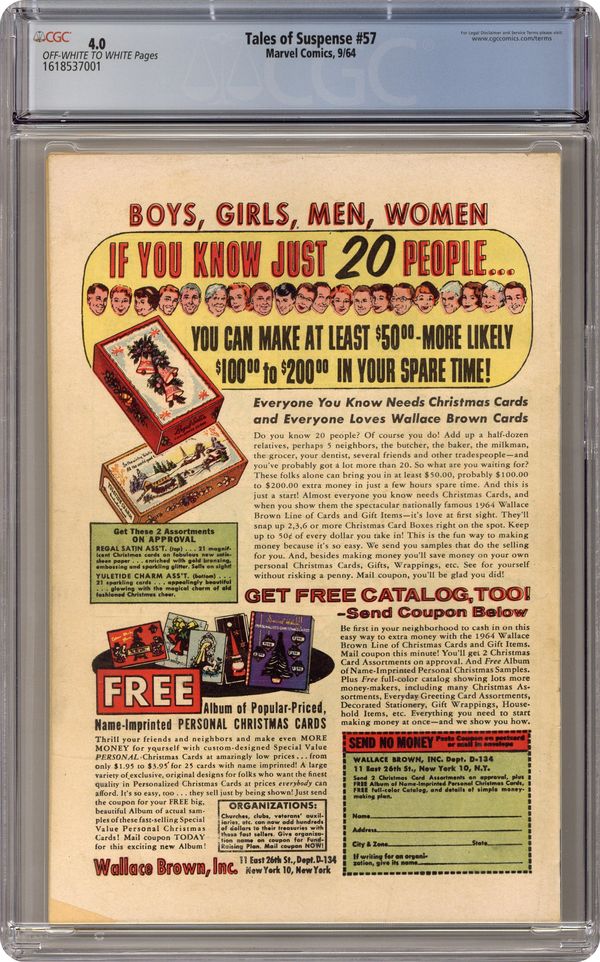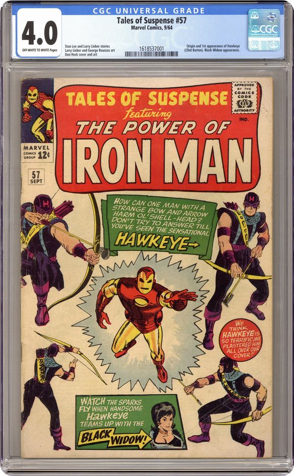Cover by Don Heck. First appearance of Hawkeye in "Hawkeye, the Marksman!", script by Stan Lee, art by Don Heck; A carnival marksman tries to become a super-hero, but after a misunderstanding with the police he falls in with the Black Widow; Hawkeye attacks Iron Man at the Widow's request, but when he accidentally injures his partner in the fight he flees to get her to safety. "The Runner" text story. "The Watcher's Power!", script by Stan Lee (plot) and Larry Lieber (script), pencils by Larry Lieber, inks by George Roussos (as George Bell); Space Pirates plan to attack a rich planet, thinking the Watcher will not interfere; They are destroyed because they unknowingly targeted the Watcher's home world, the one planet that he can interfere with. 36 pages, full color. Cover price $0.12. Grade: CGC 4.0 explanation of grade Condition: Used (collectible)