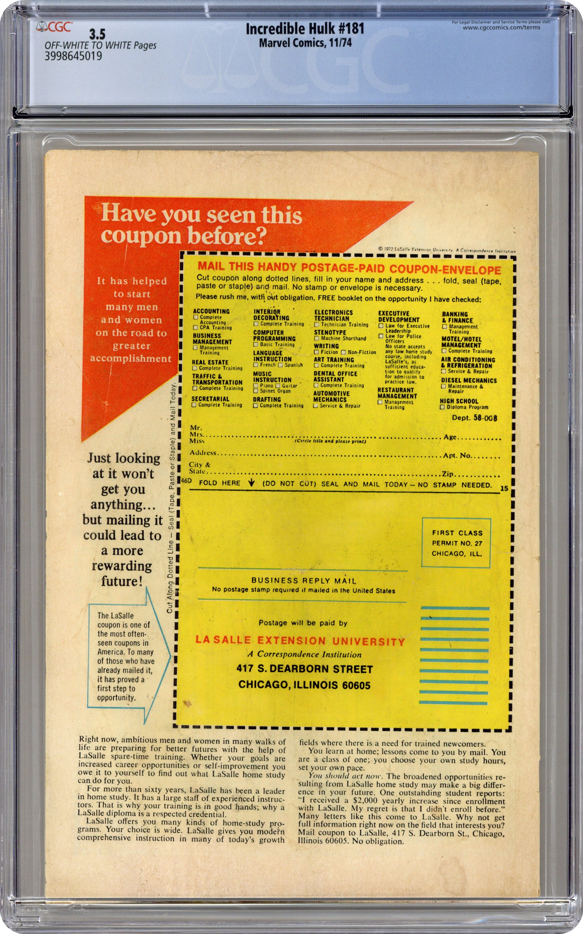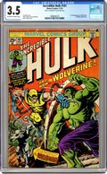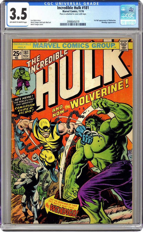 First full Wolverine story (cameo appearance in previous issue). Cover art by Herb Trimpe. And Now...The Wolverine!, script by Len Wein, pencils by Herb Trimpe, inks by Jack Abel; Canadian super-agent Wolverine teams up with the Hulk to battle Wendigo; Once the monster is felled, however, Wolvie turns on the Hulk and the two battle; Marie goes ahead with her plans of trying to transfer the power of the Wendigo into the Hulk but when the guilt becomes too much for best friend Georges who feels responsible for Paul's monstrous condition, he works the change on himself; Paul Cartier is returned to human form and Georges becomes the Wendigo. Wendigos story continues in Monsters Unleashed 9.Marvel Value Stamp #54 (Shanna). Letter from Mary Jo Duffy. 36 pgs. $0.25. Cover price $0.25. Grade: CGC 3.5 explanation of grade Condition: Used (collectible)