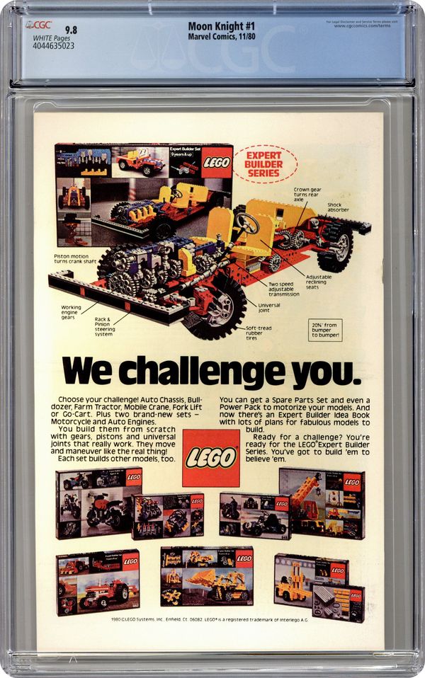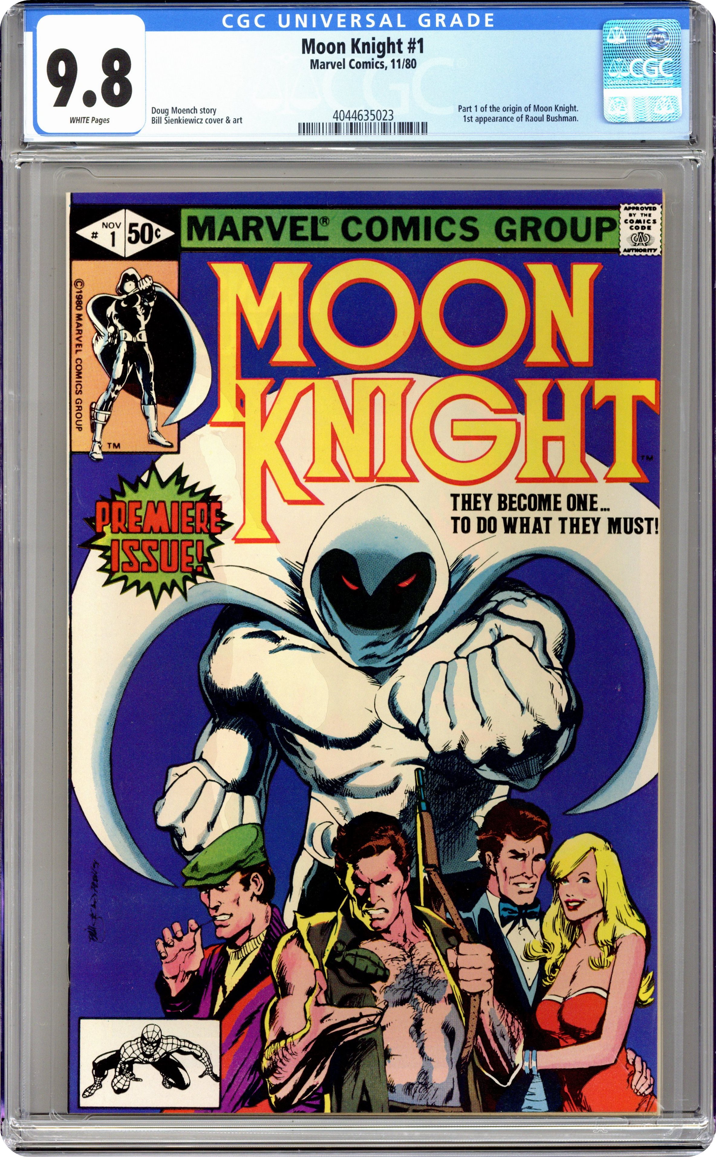 Direct Edition. "The Macabre Moon Knight!" Written by Doug Moench. Art by Bill Sienkiewicz. Mercenary, Wall Street wizard, a street smart cabbie, masked-avenger - Marc Spector is all of these things and more. Nothing before could have possibly prepared you for the strange world of Moon Knight! 32 pages, FC. NOTE: 1st appearance of Bushman. Cover price $0.50. Grade: CGC 9.8 explanation of grade Condition: Used (collectible)