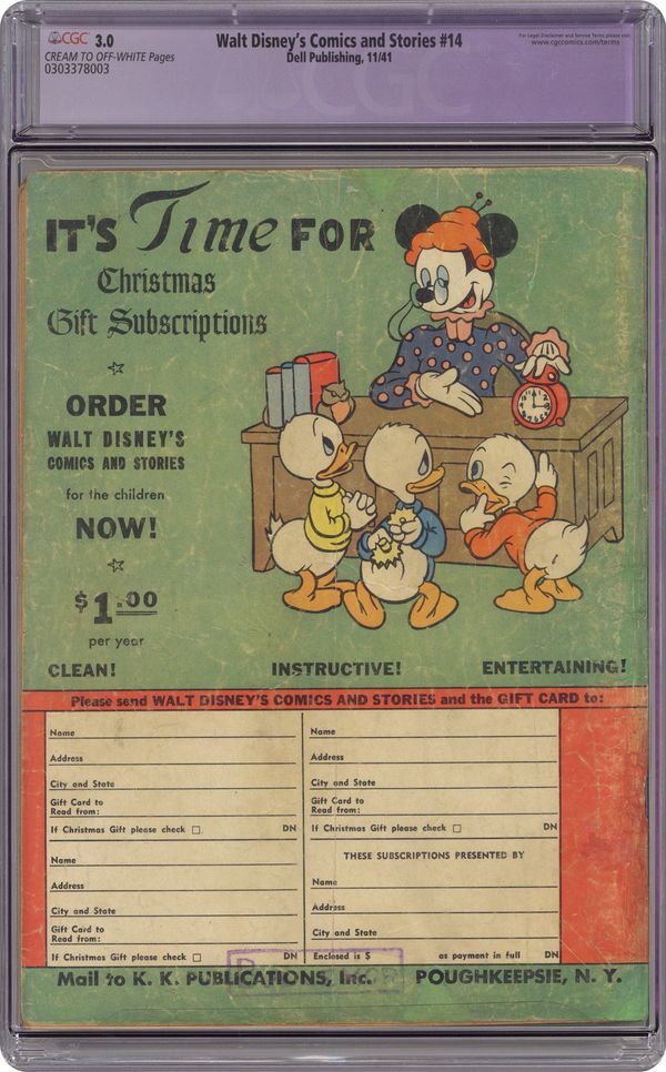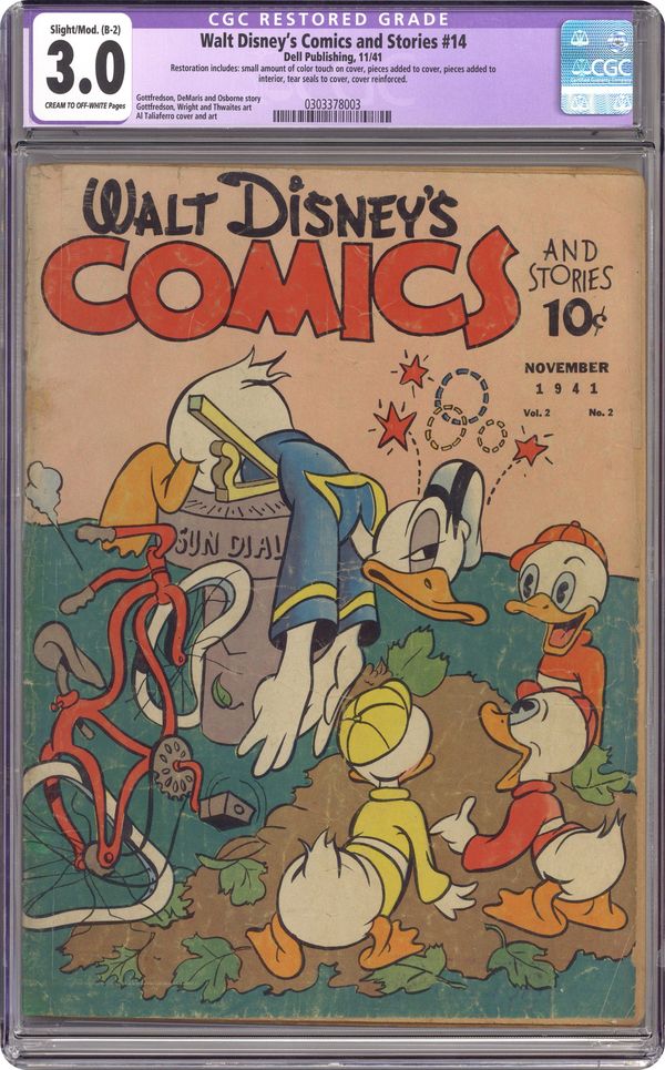 Published Nov 1941 by Dell/Gold Key.Walt Disney's Comics and Stories (1940 Dell/Gold Key/Gladstone) 14 CGC 3.0 Restored