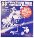 Promoting the 33rd annual World Science Fiction con, which took place in Melbourne in 1975 and featured guests Ursula K. Le Guin, Isaac Asimov, Ray Bradbury, Arthur C. Clarke, Michael Moorcock, Robert Heinlein, and more. High quality print on heavy matte stock. 13" x 14 1/2". Poster was rolled as originally issued.