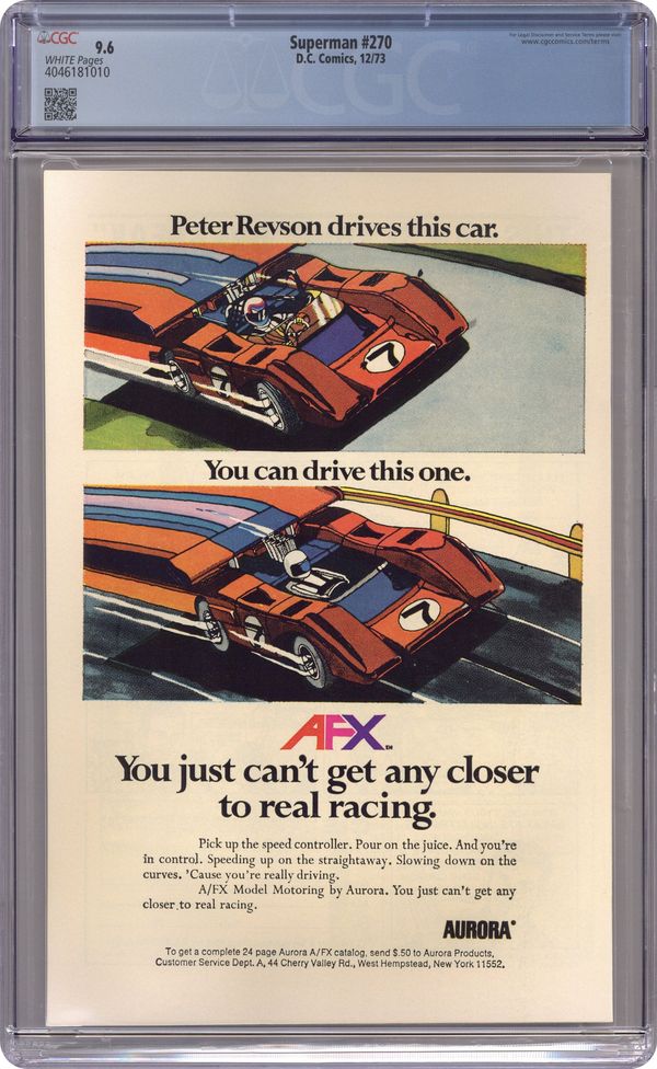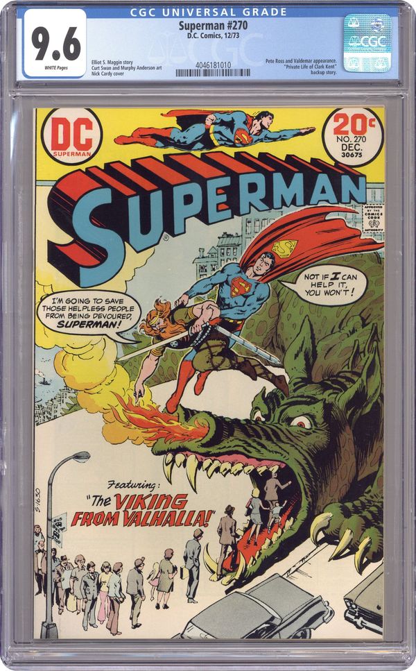 Ended Dec 29 2023 Winning Bid $33 Cover art by Nick Cardy. The Viking from Valhalla! starring Superman, Valdemar, Clark Kent, Oscar Asherman, Steve Lombard, Lois Lane, and Skagerrak, script by Elliot S! Maggin, pencils by Curt Swan, inks by Murphy Anderson. I Can't Go Home Again!--Private Life of Clark Kent, script by Elliot S! Maggin, art by Murphy Anderson; When the plans for a new highway go right through the Kent home in Smallville, Clark returns for one last visit; Pete Ross sees Clark and recalls how he recommended the highway be put through the Kent home to destroy any remaining evidence of Clark's double identity there. 36 Pages, Full Color. Cover price $0.20. Grade: CGC 9.6 explanation of grade Condition: Used (collectible)