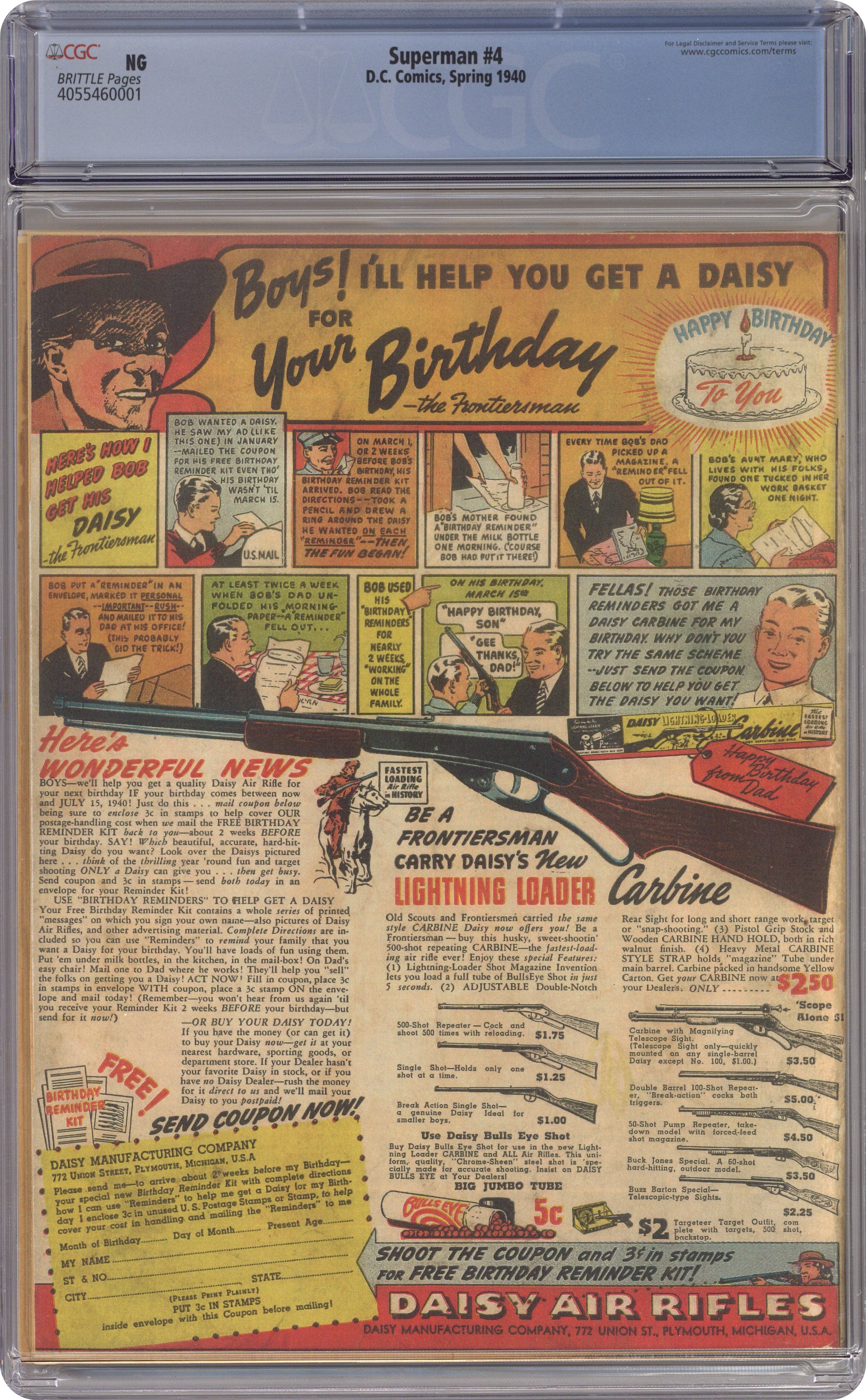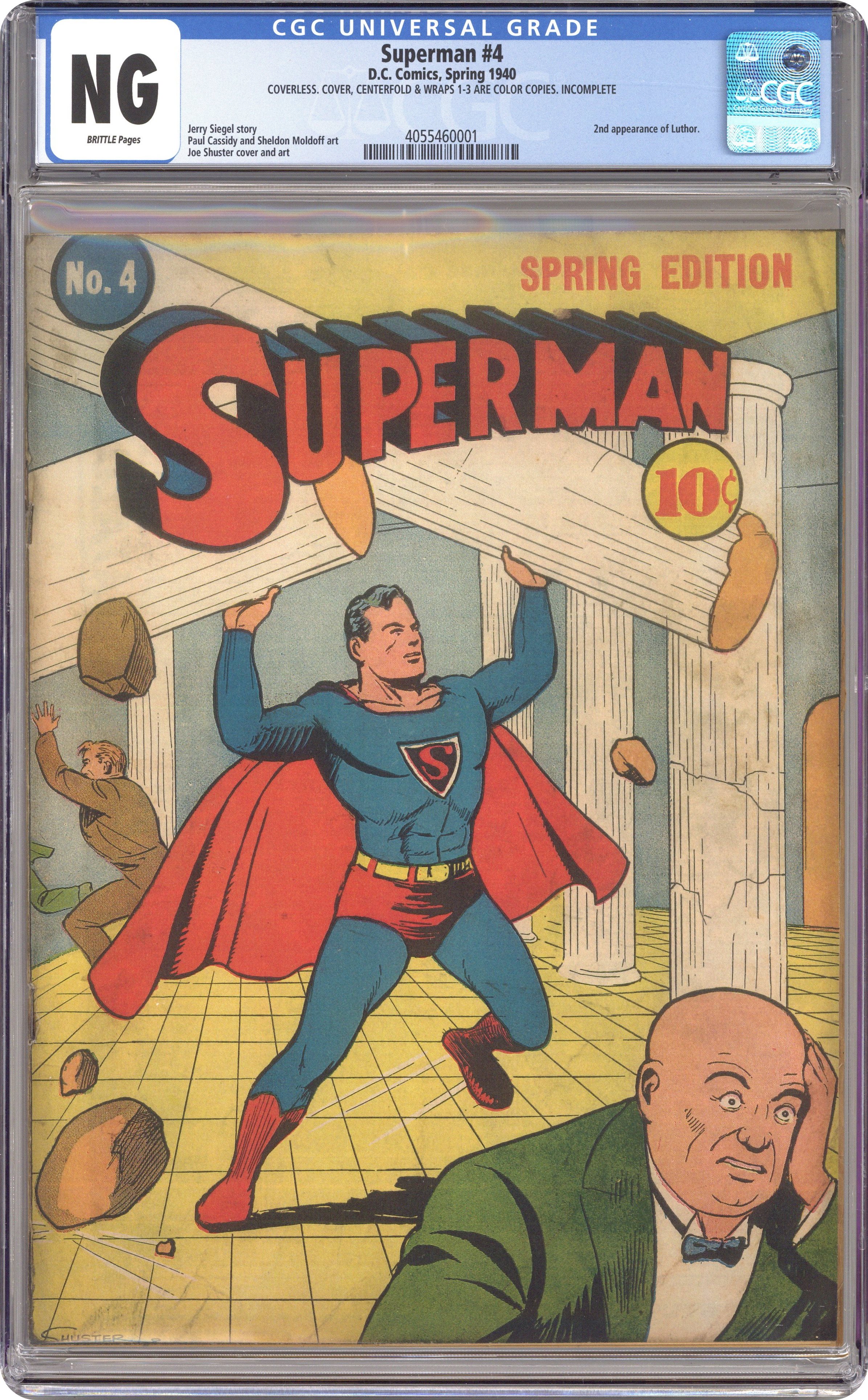 Ended Oct 15 2023 Winning Bid $435 Cover art by Joe Shuster. Superman versus Luthor, script by Jerry Siegel, art by Paul Cassidy [as Joe Shuster]; When Clark Kent begins to investigate a new weapon being tested by the Army that artificially causes earthquakes, little does he know that Lex Luthor is hot on the trail of securing the plans for that invention, one way or the other. Attaining Super-Strength tips. This Doggone World by Fred Schwab. From The 4 Corners fact page by Sheldon Moldoff. Untitled Superman story, script by Jerry Siegel, pencils by Joe Shuster, inks by Paul Cassidy [as Joe Shuster]; Superman faces off once again with the evil Luthor, who first has tapped oil from oil wells all over the world for his purposes, then inundating the western coast of the U.S. when he raises a glass-enclosed city of ancient weird design from the murky depths. Superman of America contest info. Changer of Destiny text story, script by Hugh Langley, art by Fred Guardineer. Untitled Superman story, script by Jerry Siegel, pencils by Joe Shuster, inks by Paul Cassidy [as Joe Shuster]; The suicide of the author of a manuscript, which states that sinister forces seek to retard this nation's return to prosperity, prods Superman to dart from place to place, averting the disasters that have been planned by these forces to disrupt vital aspects of national industries. Untitled Superman story, script by Jerry Siegel, pencils by Joe Shuster, inks by Paul Cassidy [as Joe Shuster]; Superman pretends to join a group of racketeers who want to control the city's truck drivers' union so that they can paralyze food distribution and demand blackmail. 68 Pages, Full Color. Cover price $0.10. Grade: CGC 0.3 explanation of grade Condition: Used (collectible)