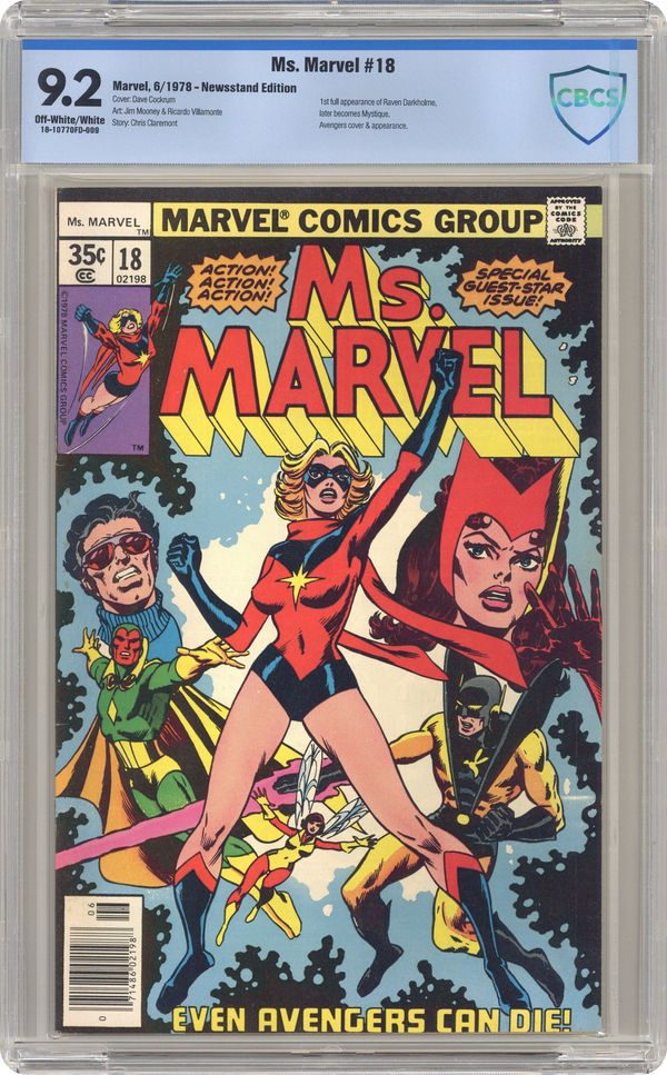 Dave Cockrum cover (pencils & inks). Chris Claremont script. Jim Mooney & Ricardo Villamonte art. "The St. Valentine's Day Avengers Massacre" Ms. Marvel and the Avengers (Wonder Man, Vision, Scarlet Witch, YellowJacket, & the Wasp) vs. Centurion and Mystique. First *full* appearance of X-Men Character, Mystique. Cover price $0.35. Grade: CBCS 9.2 explanation of grade Condition: Used (collectible)