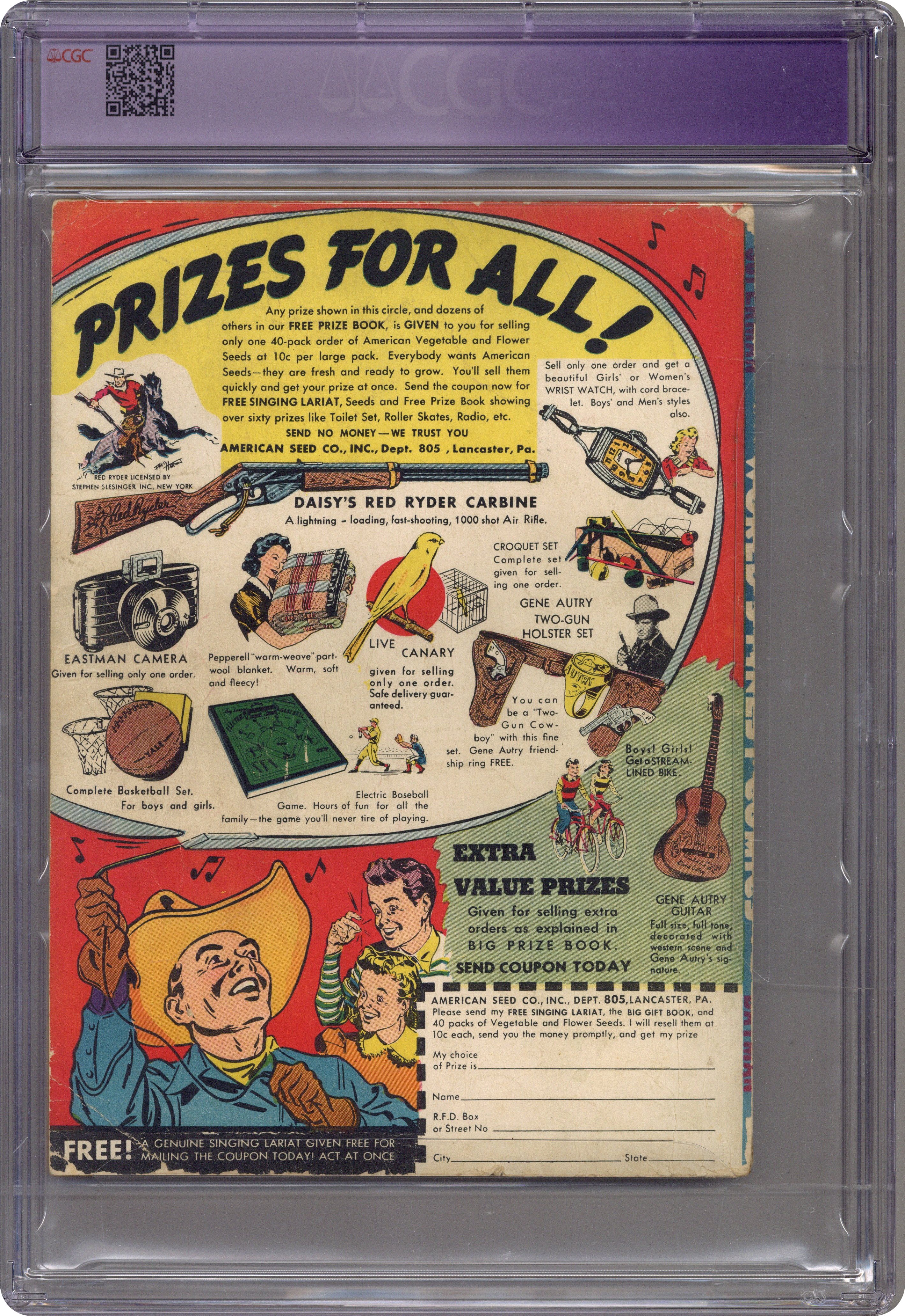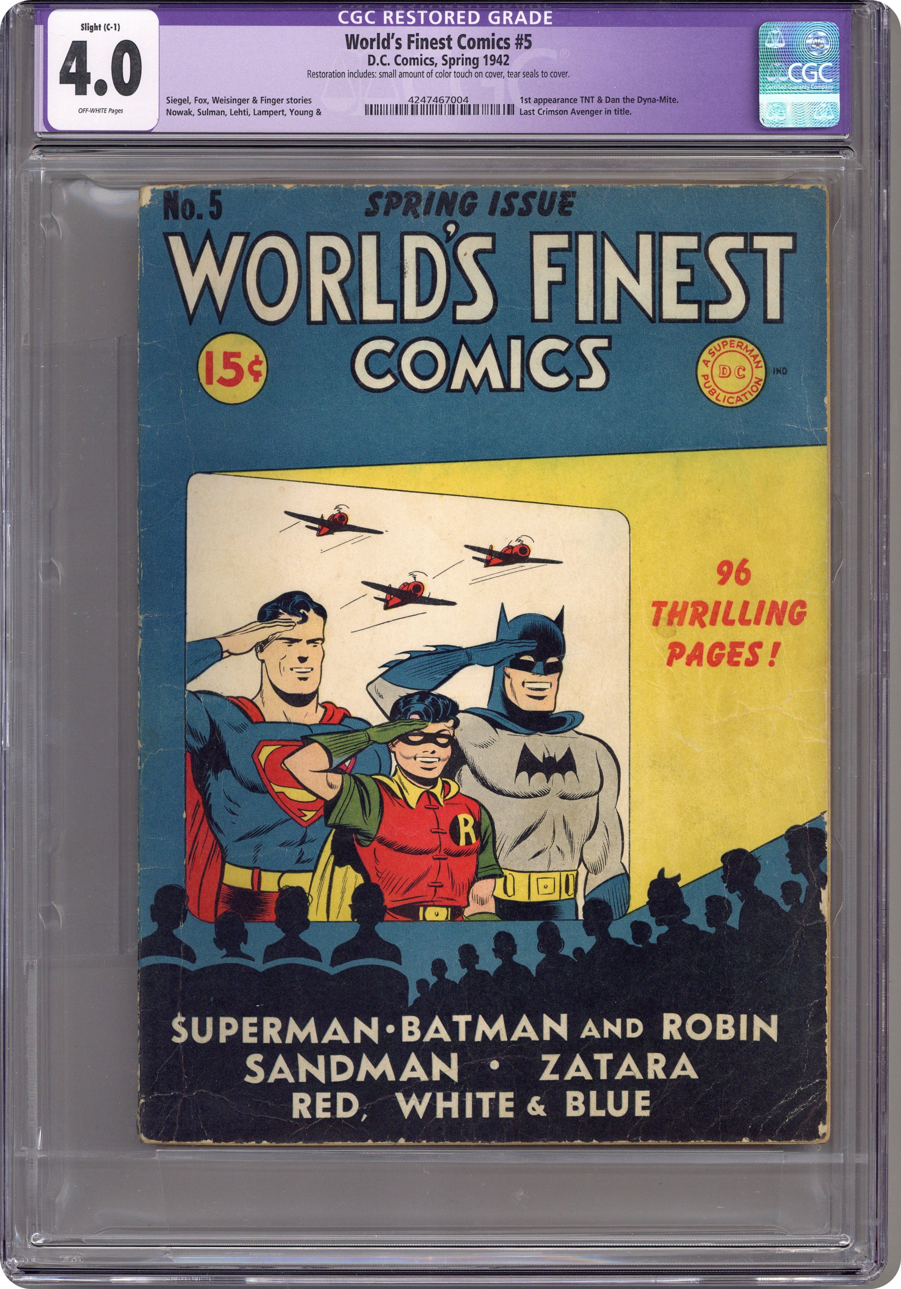 Ended Oct 20 2024 Winning Bid $381 Cover art by Fred Ray. The Tower of Terror starring Superman, script by Jerry Siegel, art by John Sikela [as Joe Shuster]; A manufacturer purchases a sacred Indian tower and tries to move it, but is faced with many attempts on his life, unaware that an ancient manuscript indicates priceless Indian valuables were secreted in the tower. The Man Who Stole A Bank starring Zatara, script by Gardner F. Fox, art by Joseph Sulman. Murder In Three Acts starring The Crimson Avenger, script and pencils by Jack Lehti, inks by Charles Paris. Tactical Error text story, script by Eric Carter, art by Cliff Young. The Case of the Crime Clown starring TNT and Dan the Dyna-Mite, script by Mort Weisinger. Wings For America starring Red, White and Blue, art by Harry Lampert. Gems of Jeopardy starring The Sandman, art by Cliff Young. none starring Goggles. Rubies For Ransom starring The King, script by Gardner F. Fox, art by Harry Lampert. The Adventure of the Good-Hearted Gangster starring Lando, Man of Magic, art by Louis Cazeneuve. Private Pete humor page by Henry Boltinoff. Crime Takes A Holiday starring Batman and Robin, script by Bill Finger, pencils by Jerry Robinson [as Bob Kane], inks by Jerry Robinson [as Bob Kane] and George Roussos (backgrounds); A "crime holiday" is declared by the mobs in Gotham City. This issue introduces TNT and Dan the Dyna-Mite. Last issue with King and the Crimson Avenger. 100 pages, Full Color. Cover price $0.15. Grade: CGC 4.0 explanation of grade Condition: Used (collectible)