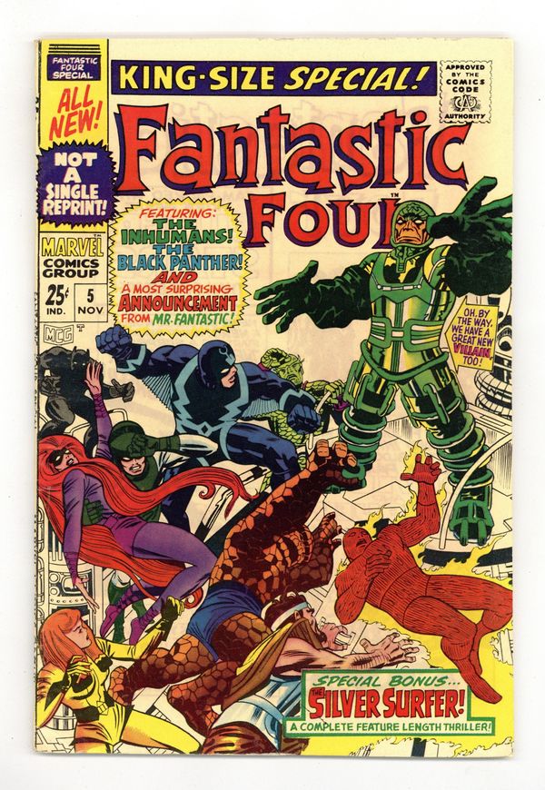 The Black Panther and the Inhumans help the FF battle Psycho-Man (his first appearaince) in "Divide and Conquer!" Script by Stan Lee, pencils by Jack Kirby, inks by Frank Giacoia (not Joe Sinnott as credited). Silver Surfer back-up (first solo story), "The Peerless Power of the Silver Surfer!" by Lee/Kirby/Giacoia. This issue also has eight pages of pin-ups by Kirby/Giacoia and a short story, "This Is a Plot?" Script and pencils by Kirby, inks by Giacoia. Kirby/Giacoia cover. 68 pages, full color. Cover price $0.25. Grade: FN- 5.5 explanation of grade Condition: Used (collectible)