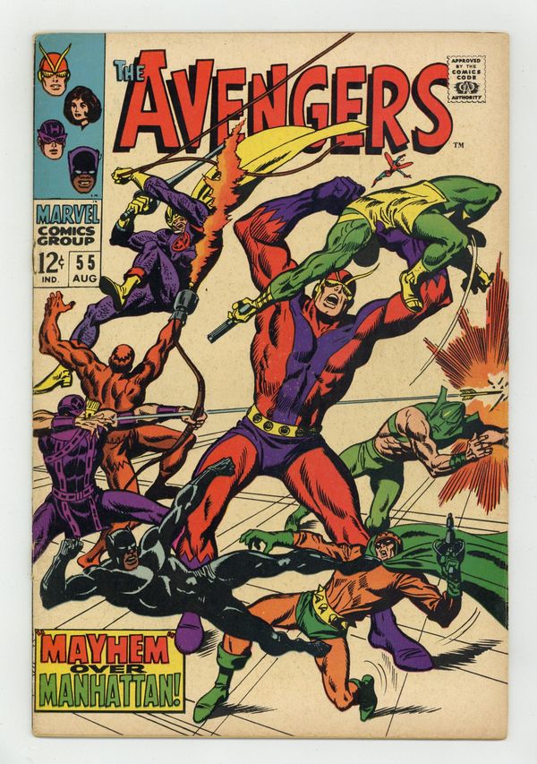First (full) appearance of Ultron in "Mayhem over Manhattan!" Part 2 of 2. Guest-starring the Black Knight. Script by Roy Thomas. Pencils by John Buscema. Inks by George Klein. Cover by John Buscema and George Roussos. One of the legendary issues of the Avengers! As Earth's Mightiest Heroes battle their greatest foe for the first time! But at this point, they don't know who or what Ultron-5 is! The four avengers are still reeling from Jarvis' betrayal, the Masters of Evil's victory, and the Crimson Cowl's identity! However Ultron doesn't care about the Avengers' confusion! Because he's just loaded them inside a hydrogen bomb... and set the bomb on a collision course with the Empire State Building! Oh my, this looks like curtains for Earth's Mightiest! Unless the resourceful Black Knight and remorseful Edwin Jarvis can think of something quick! Appearances by Aragorn, Klaw, Melter, Whirlwind, and the Radioactive Man. Avengers Lineup: Black Panther, Goliath, Hawkeye, and the Wasp. (Notes: Ultron returns in Avengers #57. This issue was reprinted in Marvel Super Action #14. This two-part story was reprinted in 1993 in the trade paperback: The Greatest Battles of the Avengers.) 36 pages. Cover price $0.12. Grade: GD 2.0 explanation of grade Condition: Used (collectible)