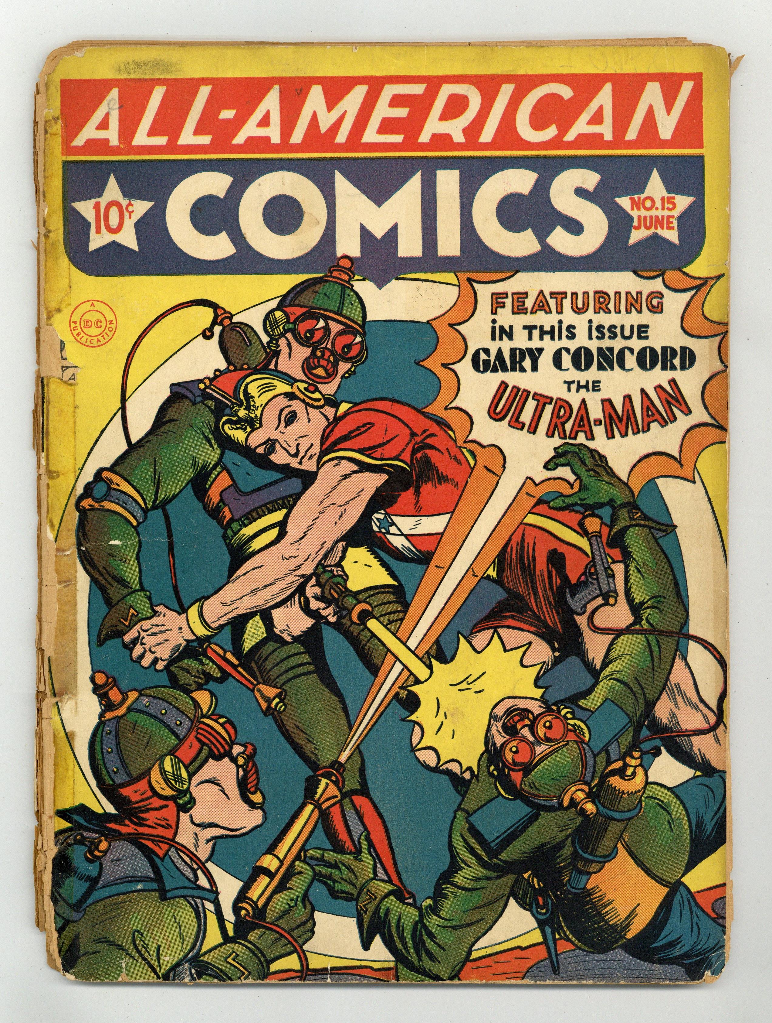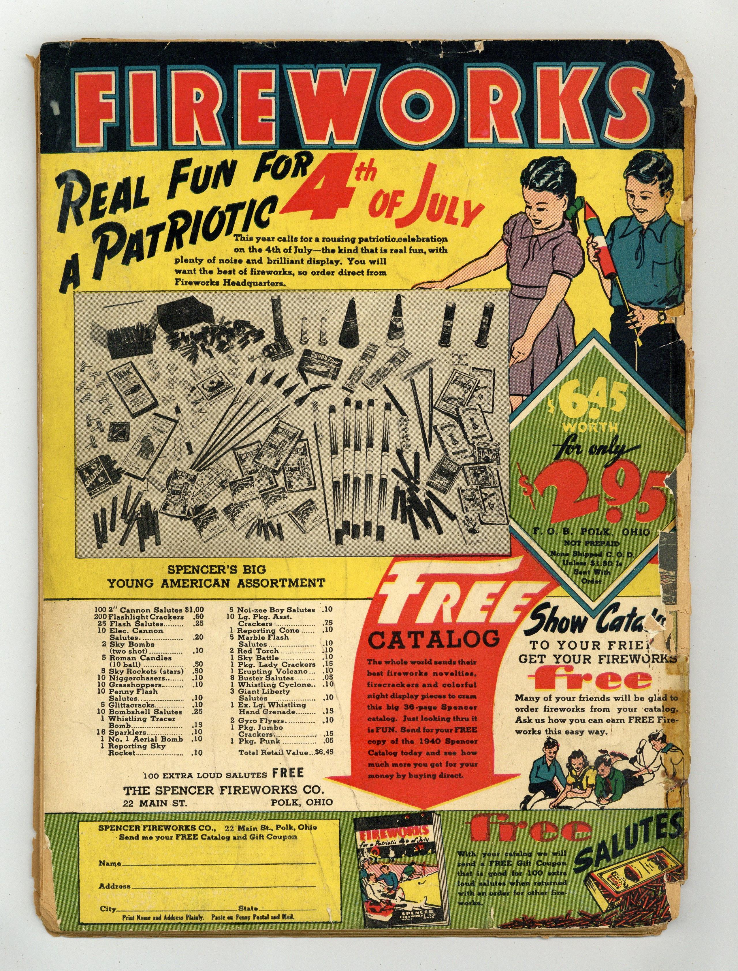 Cover art by Jon L Blummer. Marman's Monsters Have Escaped starring Gary Concord, the Ultra Man, script and art by Jon L Blummer; Garoo takes over Marman's body and leads his monsters to take over the world. Mutt and Jeff strips by Al Smith (as Bud Fisher). Believe It or Not by Robert L. Ripley. Miss Snap starring Hop Harrigan, script and art by Jon L Blummer; Miss Snap becomes Treasurer of the All-American Aviation Company and orders Hop to start a Hop Harrigan Flying Club. Ride'em Scribbly starring Scribbly, script and art by Sheldon Mayer. The Infra Red Destroyers [Part 3]--Adventures in the Unknown, script by Carl H Claudy, art by Stan Aschmeier. Tom Sawyer book review. The Big Test starring Ben Webster, script and art by Edwin Alger. Harbor Sabotage starring Red, White and Blue, script by Jerry Siegel, art by William Smith. 68 pgs. $0.10. Cover price $0.10. Grade: PR 0.5 explanation of grade Condition: Used (collectible)