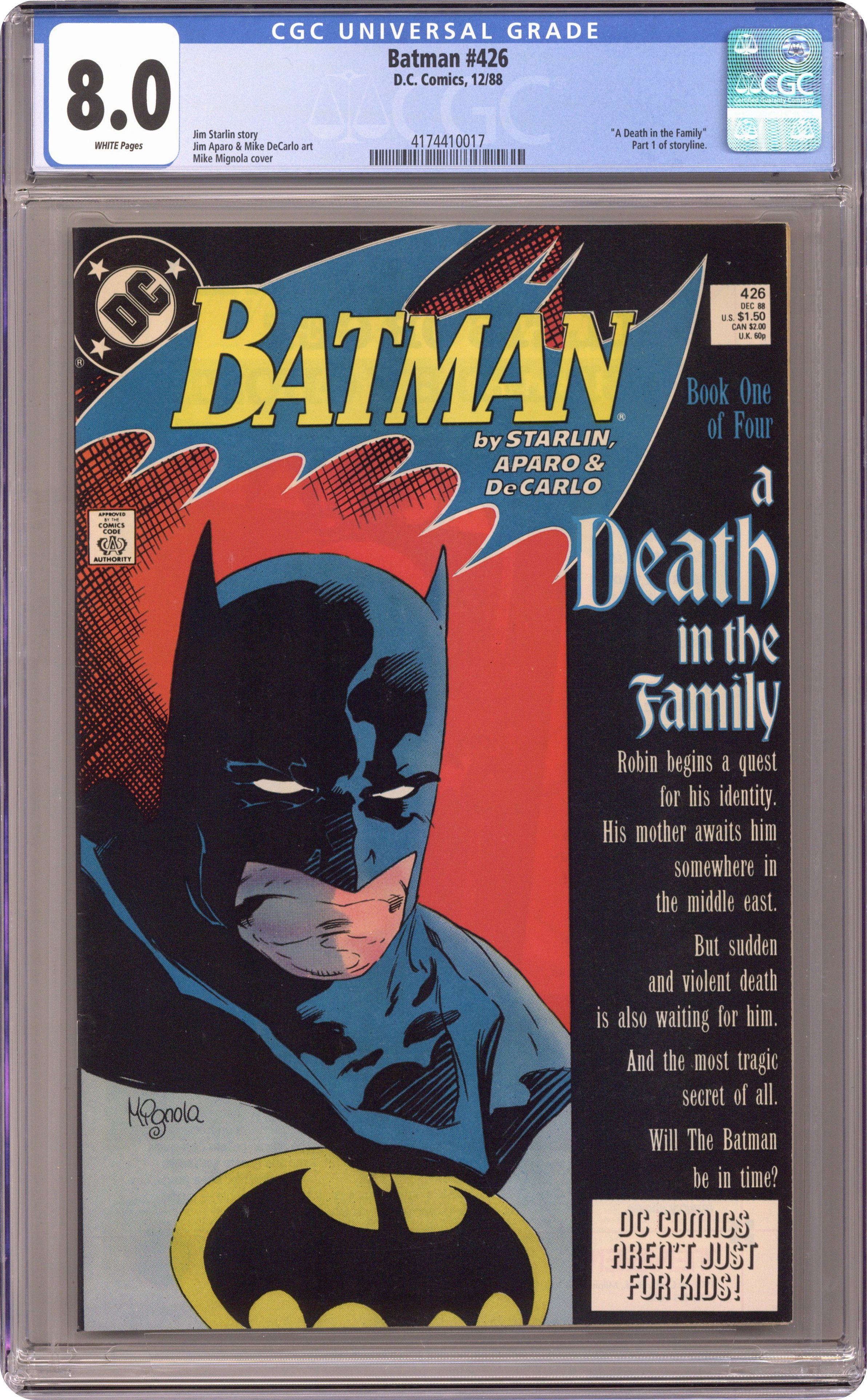 Ended Dec 20 2023 Winning Bid $26 First printing. Direct Edition. Cover art by Mike Mignola. "A Death in the Family" part 1 of 4, script by Jim Starlin, pencils by Jim Aparo, inks by Mike DeCarlo; Jason discovers that his "real" mother was really his step-mother, and his birth mother is still alive; Joker escapes from Arkham and Batman chases him to the Middle East where he runs across Jason looking for one of the women he thinks is his mom. Infamous story where readers called an 800 number, and 'voted' to have Robin killed! Story continues in Batman #427. NOTE: Most issues from 397-432 were reprinted in 1989 and sold in multipacks. These 2nd and 3rd prints have back cover ads dated 1989. 52 Pages, Full Color. Cover price $1.50. Grade: CGC 8.0 explanation of grade Condition: Used (collectible)