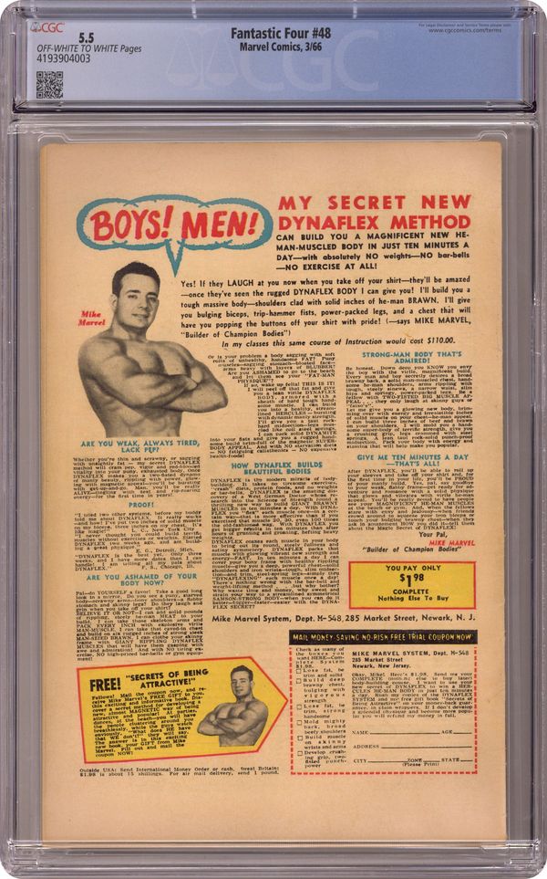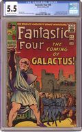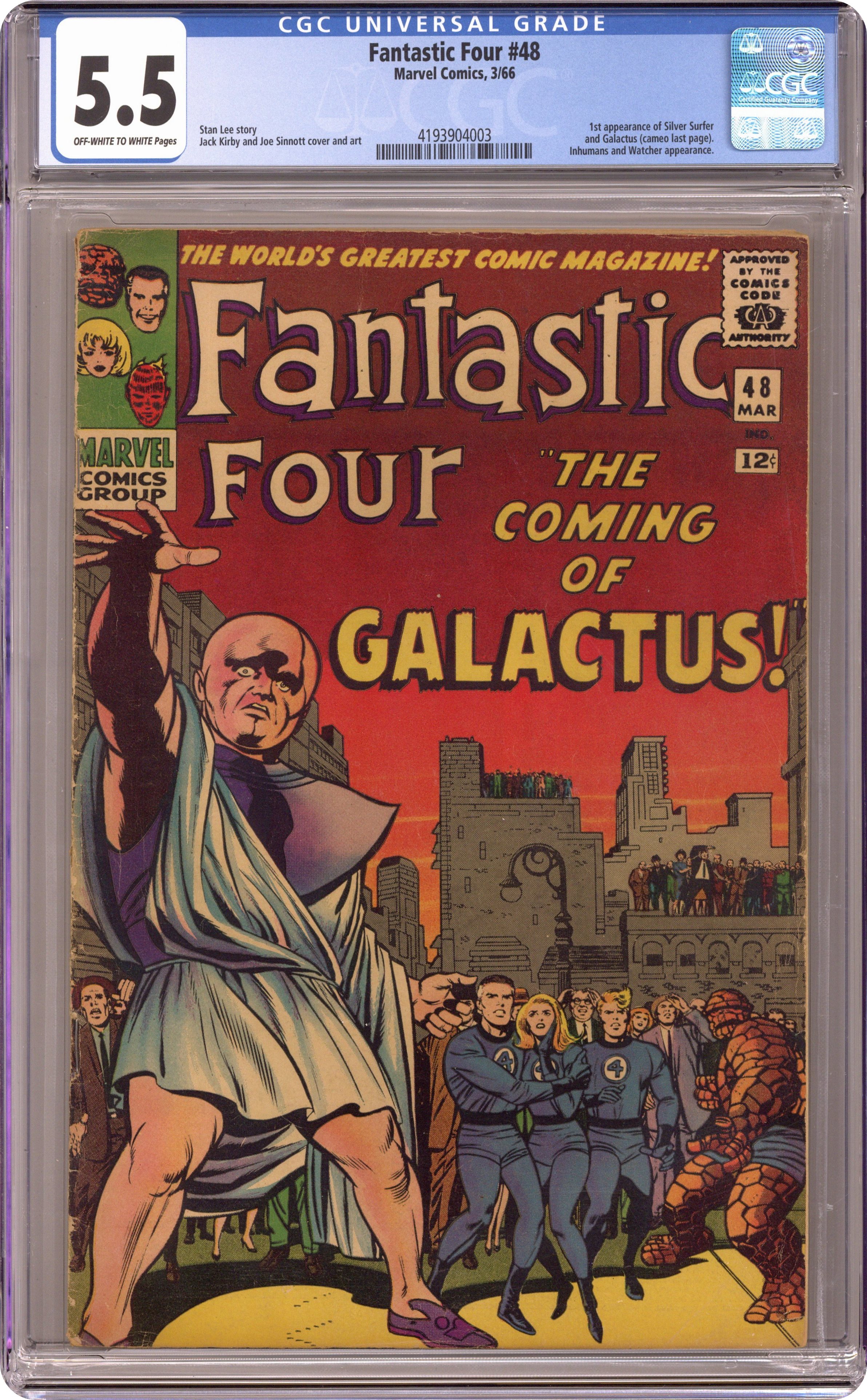 Cover pencils by Jack Kirby, inks by Joe Sinnott. First appearance of Galactus and the Silver Surfer in one of the most famous stories of the Silver Age, The Coming of Galactus!, script by Stan Lee, pencils by Jack Kirby, inks by Joe Sinnott; Black Bolt and the Fantastic Four put an end to Maximus's plan to destroy all the humans; Once the Fantastic Four return to New York the Watcher tells them of the coming danger of Galactus. Letter to the editor from comics writer Don McGregor. 36 pages, full color. Cover price $0.12. Grade: CGC 5.5 explanation of grade Condition: Used (collectible)