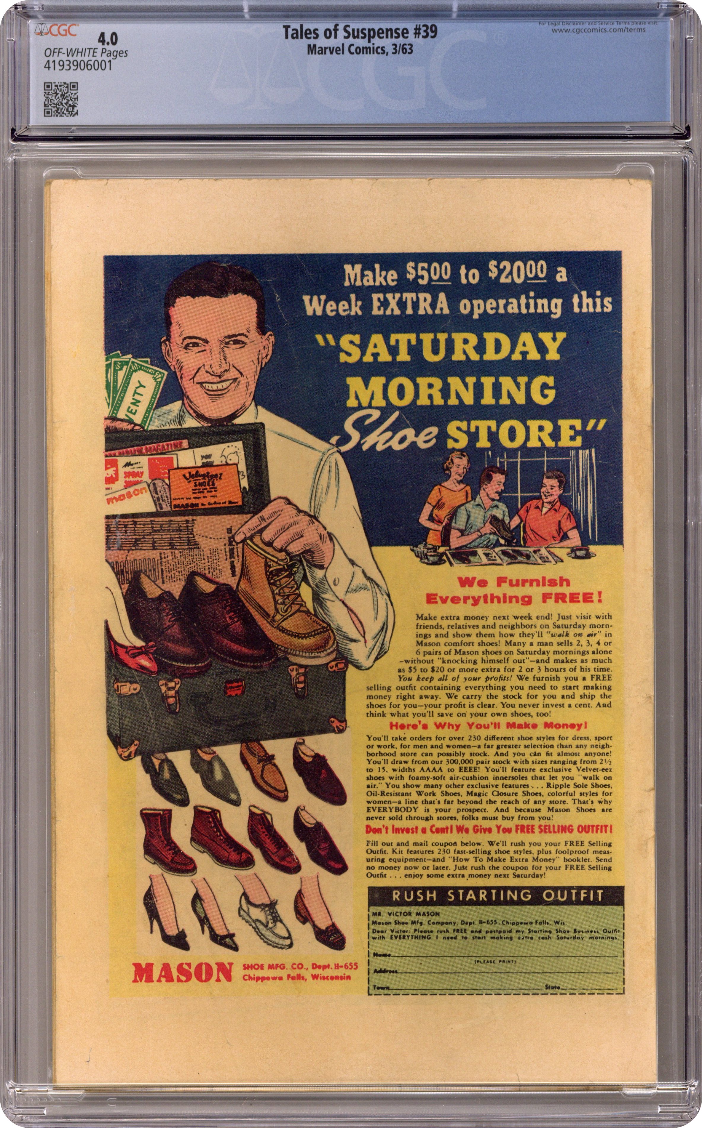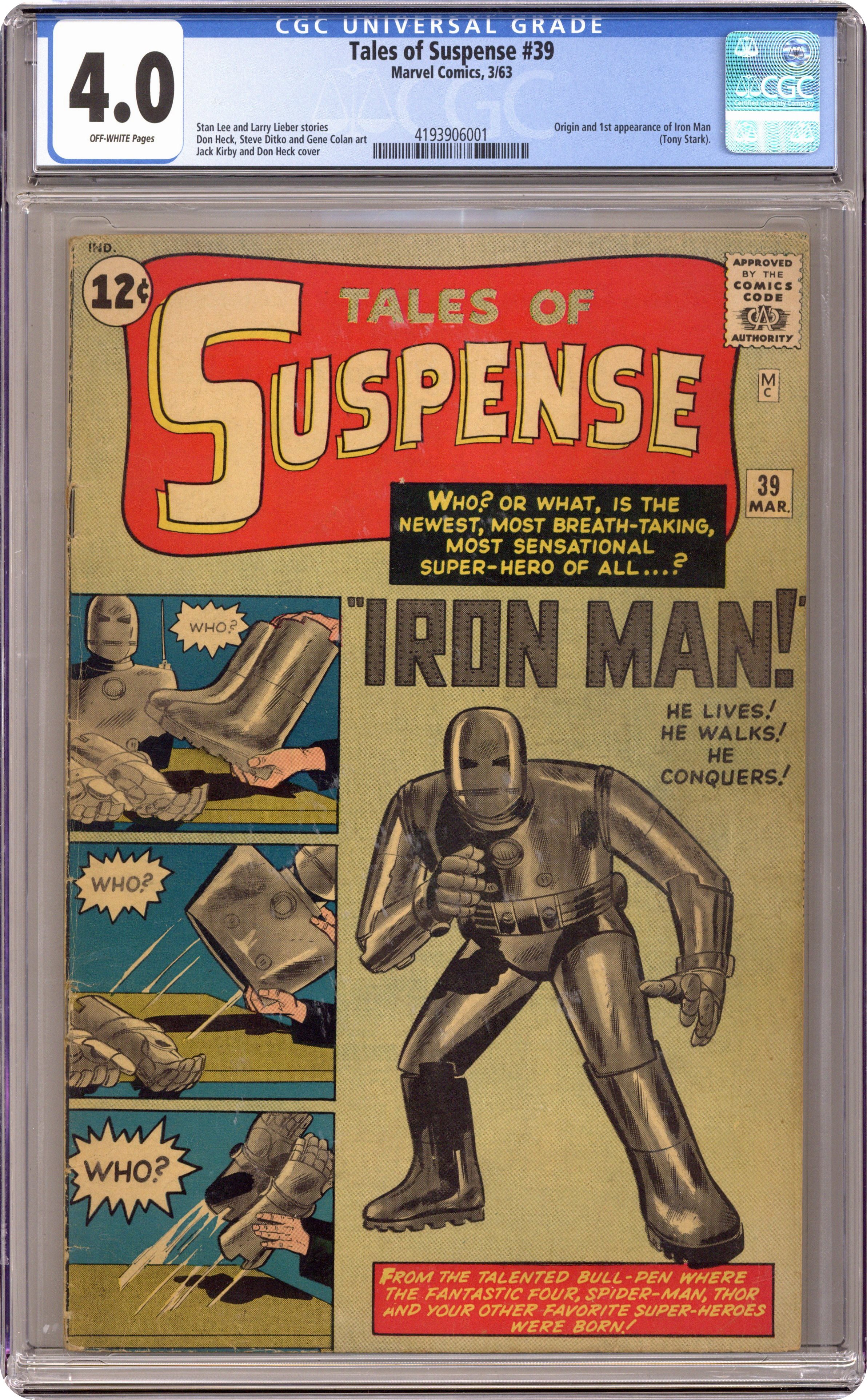Cover pencils by Jack Kirby, inks by Don Heck. First appearance of Iron Man in "Iron Man Is Born!", script by Stan Lee (plot) and Larry Lieber (script), art by Don Heck; Playboy industrialist and weapons designer Tony Stark is injured in Vietnam and captured by communists; While pretending to build a weapon for his captors he builds a suit of battle armor to keep his injured heart beating and uses it to escape and beat the communist commander. "The Treasure" text story. "The Last Rocket!", art by Gene Colan; When the sun starts dying humanity goes into space, except for two nature lovers; Just as the last rocket leaves a new sun flares to life, and the two remaining humans, Adam and Eve, rename the planet Earth. "Gundar!", script by Stan Lee, art by Steve Ditko; A shipwrecked man finds cursed Viking ghosts on an island, and his descent from the captain that cursed them releases them. 36 pages, full color. Cover price $0.12. Grade: CGC 4.0 explanation of grade Condition: Used (collectible)