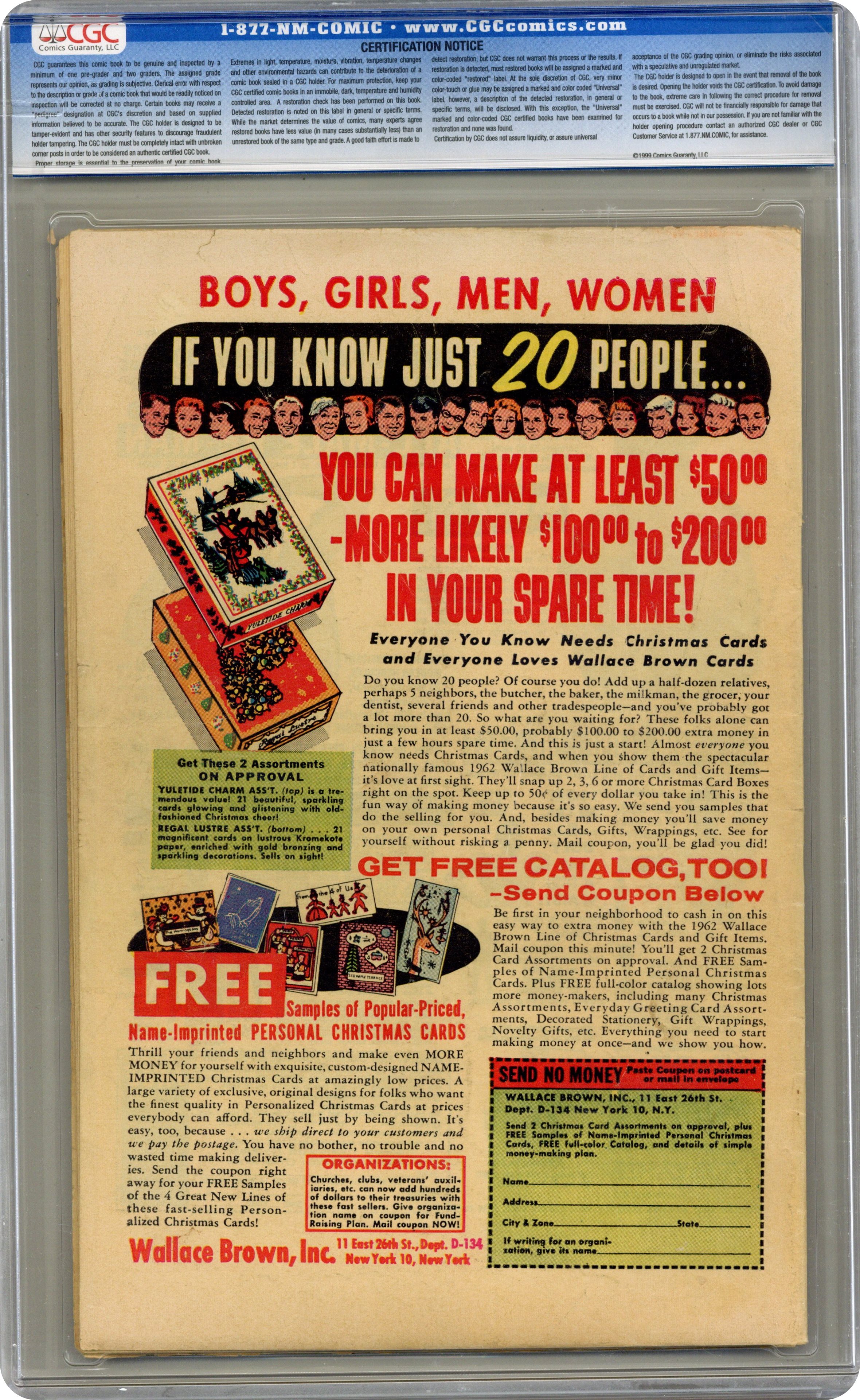Ended Oct 11 2023 Winning Bid $475 Cover pencils by Jack Kirby, inks by Joe Sinnott. Second appearance of Thor and first appearance of Jane Foster (called "Jane Nelson") in "The Mighty Thor vs. the Executioner!"; Plot by Stan Lee, script by Larry Lieber, pencils by Jack Kirby, inks by Dick Ayers; Dr. Blake joins a medical mission to a South American country wracked with civil war. The leader of the communist faction - the Executioner - orders an attack on the doctors, and Blake must use the power of Thor to save his colleagues and defeat the communists; The Executioner in this story is not the same character who will appear in issue 103. "The Recipe" text story. "The Witching Hour!", script by Stan Lee, art by Don Heck; A criminal flees to a foreign country, where people still believe in witches; He convinces a woman that he meets on the train to pretend to be a witch so that he can extort money from villagers as a fake witch hunter. "Somewhere Hides a...Thing!", script by Stan Lee, art by Steve Ditko; A dying man in the Arctic claims that he saw an alien land; His friends search for alien, but they dont realize that an iceberg is its disguised space ship, and think it was a hallucination. 36 pgs., full color. $0.12. Cover price $0.12. Grade: CGC 2.5 explanation of grade Condition: Used (collectible)