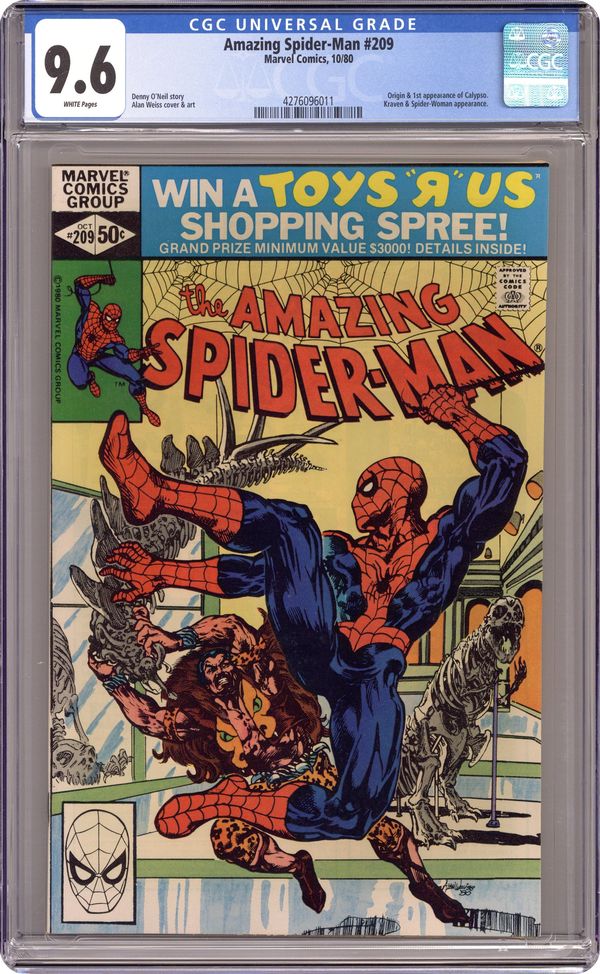 Direct Edition. "To Salvage My Honor!" First appearance of Calypso. Script by Denny O'Neil. Pencils by Alan Weiss. Inks by Klaus Janson, Bob McLeod, Joe Rubinstein, Bob Wiacek, and Al Milgrom. Cover by Alan Weiss. The specter of Spider-Man still haunts Kraven the Hunter! But Kraven's new accomplice, Calypso, has a plan to change that! While delivering a herd of exotic animals to the city, Calypso releases them to run wild in the streets! And then blames the web-slinger for setting them free! After Kraven subdues the loose animals, he vows to make the wall-crawler pay for this (alleged) indignity! And the next evening at the Museum of Natural History, the Amazing Spider-Man and Kraven the Hunter clash again! The survival of the fittest! Cameo appearance by Spider-Woman. (Note: Kraven and Calypso appear next in Spectacular Spider-Man 65.) 36 pages Cover price $0.50. Grade: CGC 9.6 explanation of grade Condition: Used (collectible)