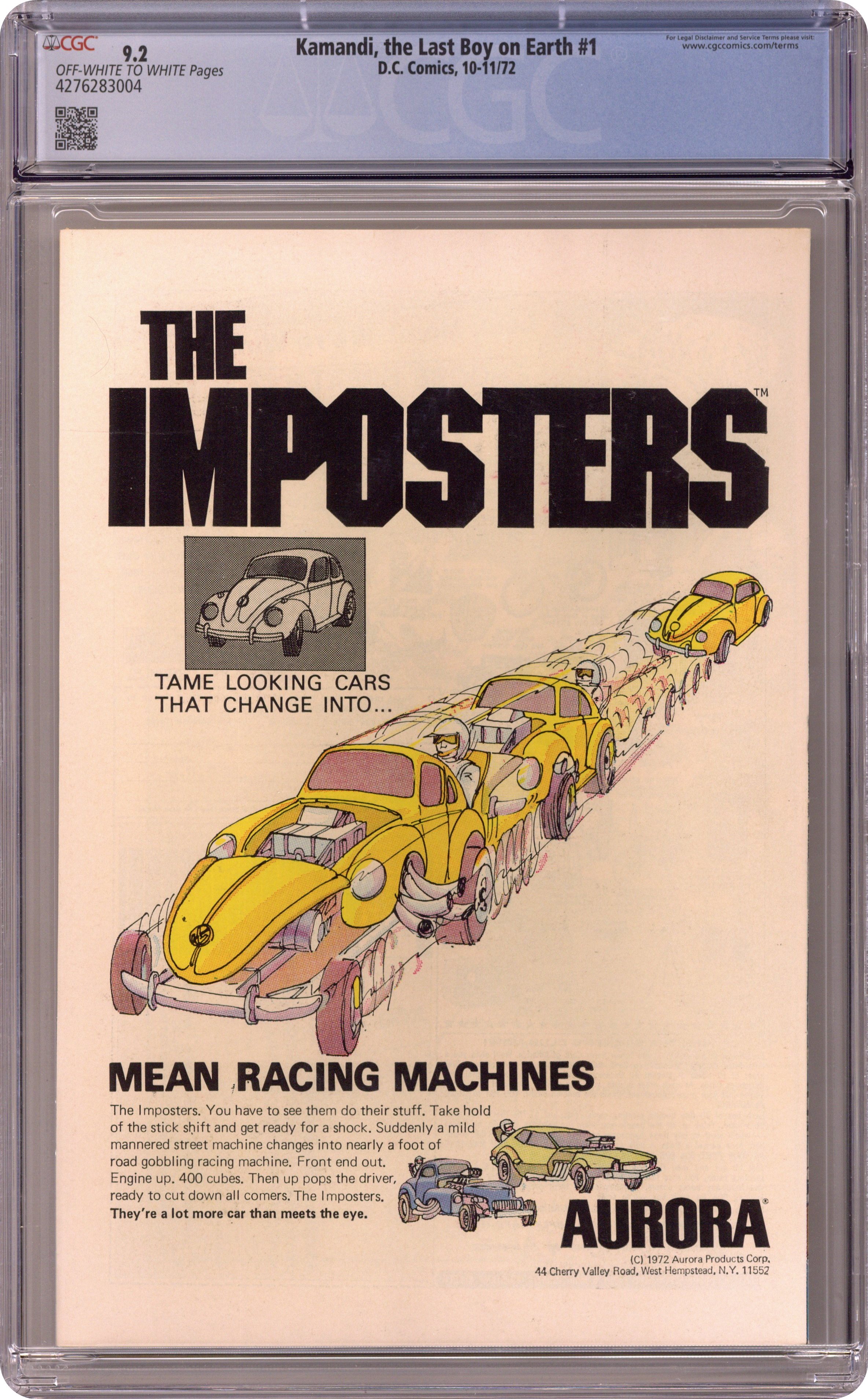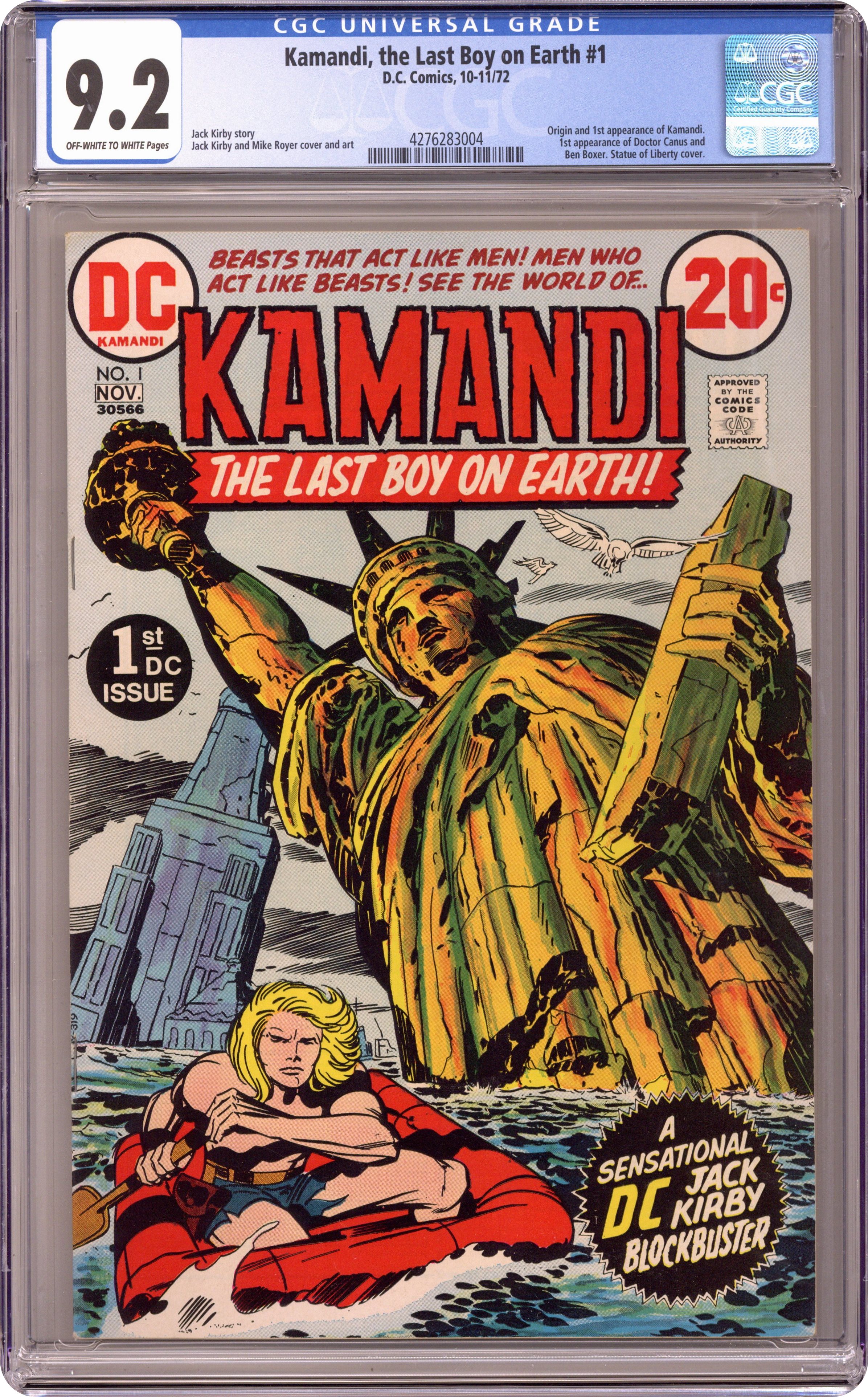 Ended Oct 15 2023 Winning Bid $81 1st appearance and origin of Kamandi. "The Last Boy on Earth." Script and pencils by Jack Kirby, inks by Mike Royer. Cover by Kirby and Royer. A series that borrows many concepts from Planet of the Apes, Kamandi takes place in an alternate future where animals have mutated into bipedal beings of intelligence and where humans are treated like savage beasts. Kamandi avenges the death of his grandfather, who was killed by wolves, but is then captured by a tiger named Caesar, who turns him over to dog-scientist Dr. Canus. Canus proceeds to help Kamandi, and this is where the so-called last boy on earth hooks up with Ben Boxer, a mutated human who can turn to living metal. Cover price $0.20. Grade: CGC 9.2 explanation of grade Condition: Used (collectible)
