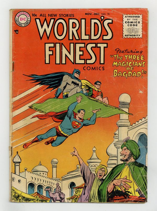 Ended Sep 26 2023 Winning Bid $39 Cover art by Winslow Mortimer. The Three Magicians of Baghdad, script by Edmond Hamilton, pencils by Dick Sprang, inks by Stan Kaye; Batman and Robin are sent into the past by Dr. Nichols, but he is unable to return them to the present; He calls upon Superman to help him, so Superman travels to the past to meet Batman and Robin. Together, they help Aladdin by having Superman pose as the genii in Aladdin's lamp. Little Pete humor page by Henry Boltinoff. Archer From Across the Sea starring Green Arrow, script by George Kashdan, art by George Papp. Do You Know Your Neighbors public service announcement starring Buzzy, script by Jack Schiff, art by Win Mortimer. How To Train A Dog text article. Weapon of Peace starring Tomahawk, script by Ed Herron, pencils by Bruno Premiani, inks by Ray Burnley. Sagebrush Sam humor page by Henry Boltinoff. 36 Pages, Full Color. Cover price $0.10. Grade: GD+ 2.5 explanation of grade Condition: Used (collectible)