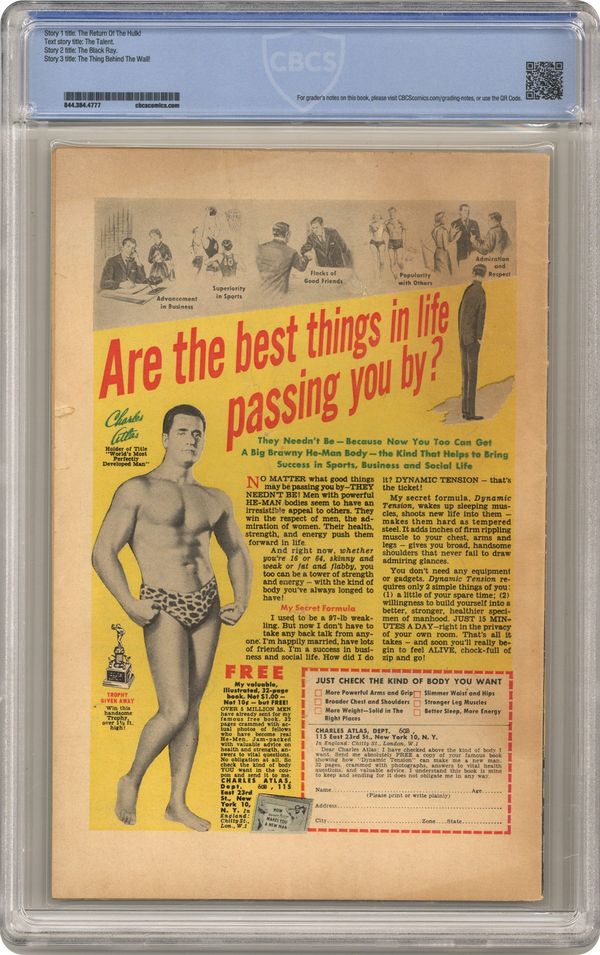 Ended Oct 25 2023 Winning Bid $134 Cover pencils by Jack Kirby, inks by Dick Ayers. "The Return of the Hulk!," pencils by Jack Kirby, inks by Dick Ayers; The Hulk returns from space and takes over a small town to get revenge on the human that defeated him. "The Black Ray," art by Paul Reinman; An imprisoned criminal scientist pretends to make a medical device which is in fact a time machine. "The Thing Behind the Wall!," art by Steve Ditko; A thief passes through a wall and is confronted by an evil entity that plans to invade Earth; He escapes, only to be arrested and jailed; He doesnt know if it was real, but is too afraid to touch the wall of his cell and find out. 36 pgs., full color. $0.10. Cover price $0.10. Grade: CBCS 3.5 explanation of grade Condition: Used (collectible)