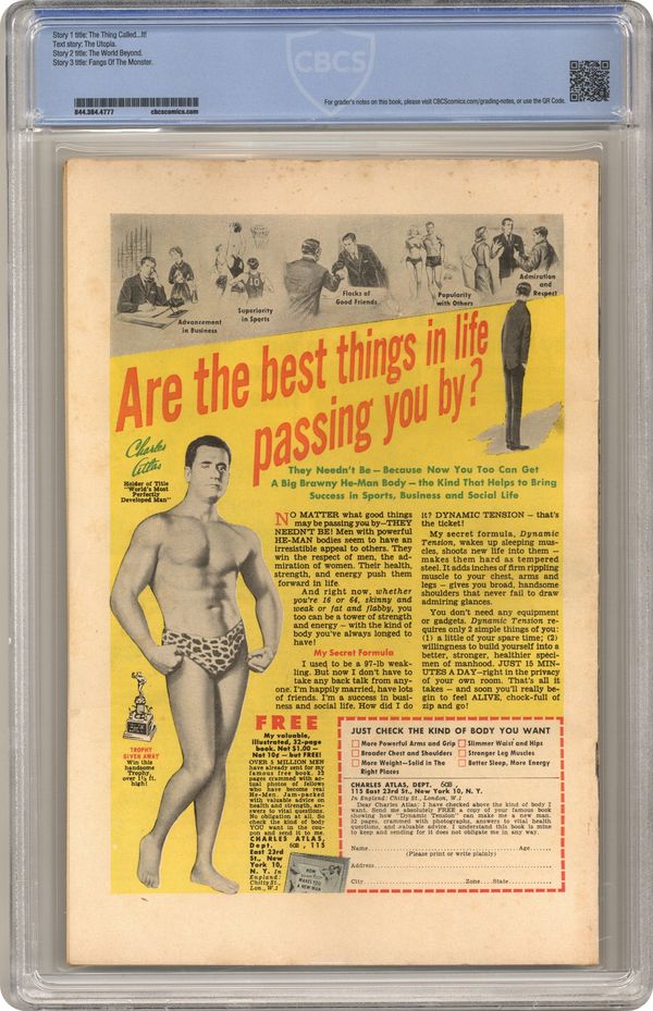 Ended Nov 22 2023 Winning Bid $131 Cover pencils by Jack Kirby, inks by Dick Ayers. "The Thing Called...It!", pencils by Jack Kirby, inks by Dick Ayers; A scientist builds a creature to kill a rival, but it refuses to obey; Its creator turns the local people against it. "The Utopia" text story, art by Joe Maneely. "The World Beyond," art by Steve Ditko; A scientist creates a pill to shrink himself to subatomic size, convinced that whole other worlds exist at microscopic levels; His pill works, and he vanishes into a whole new world called Earth. "Fangs of the Monster," art by Don Heck; A cruel hunter pursues a sea monster for sport, but finds himself at its mercy; The creature is intelligent and telepathically berates the hunter. 36 pgs., full color. Cover price $0.10. Grade: CBCS 5.0 explanation of grade Condition: Used (collectible)