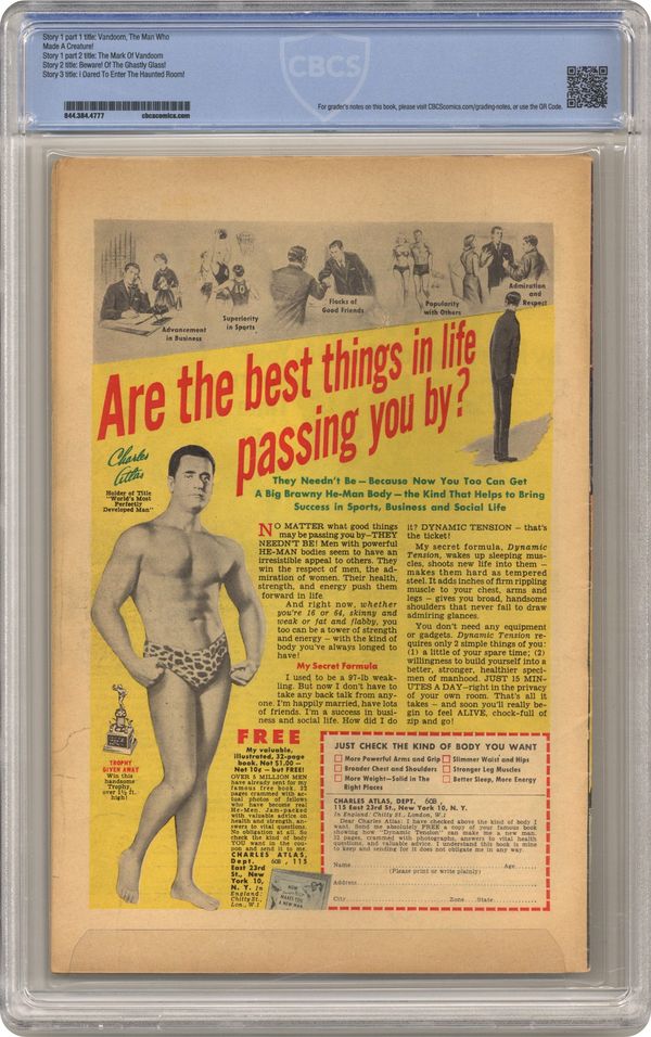 Ended Oct 13 2023 Winning Bid $84 Cover by Jack Kirby, Steve Ditko, and Dick Ayers. Vandoom, the Man Who Made a Creature!, art by Jack Kirby and Dick Ayers; Vandoom, the owner of a Transylvanian wax museum, sets out to build a new monster in order to bring customers back to the museum. Chapter 2: The Mark of Vandoom, art by Jack Kirby and Dick Ayers. The Spirit text story. Beware! Of the Ghastly Glass!, art by Steve Ditko; A man kills to gain possession of a magic crystal that grants him four wishes, but even his carefully worded wishes backfire, stranding him on the Moon. I Dared to Enter the Haunted Room!, art by Don Heck; A scientist builds an ultimate bomb and plans to use it to hold the world hostage. 36 pgs., full color. $0.10. Cover price $0.10. Grade: CBCS 3.5 explanation of grade Condition: Used (collectible)