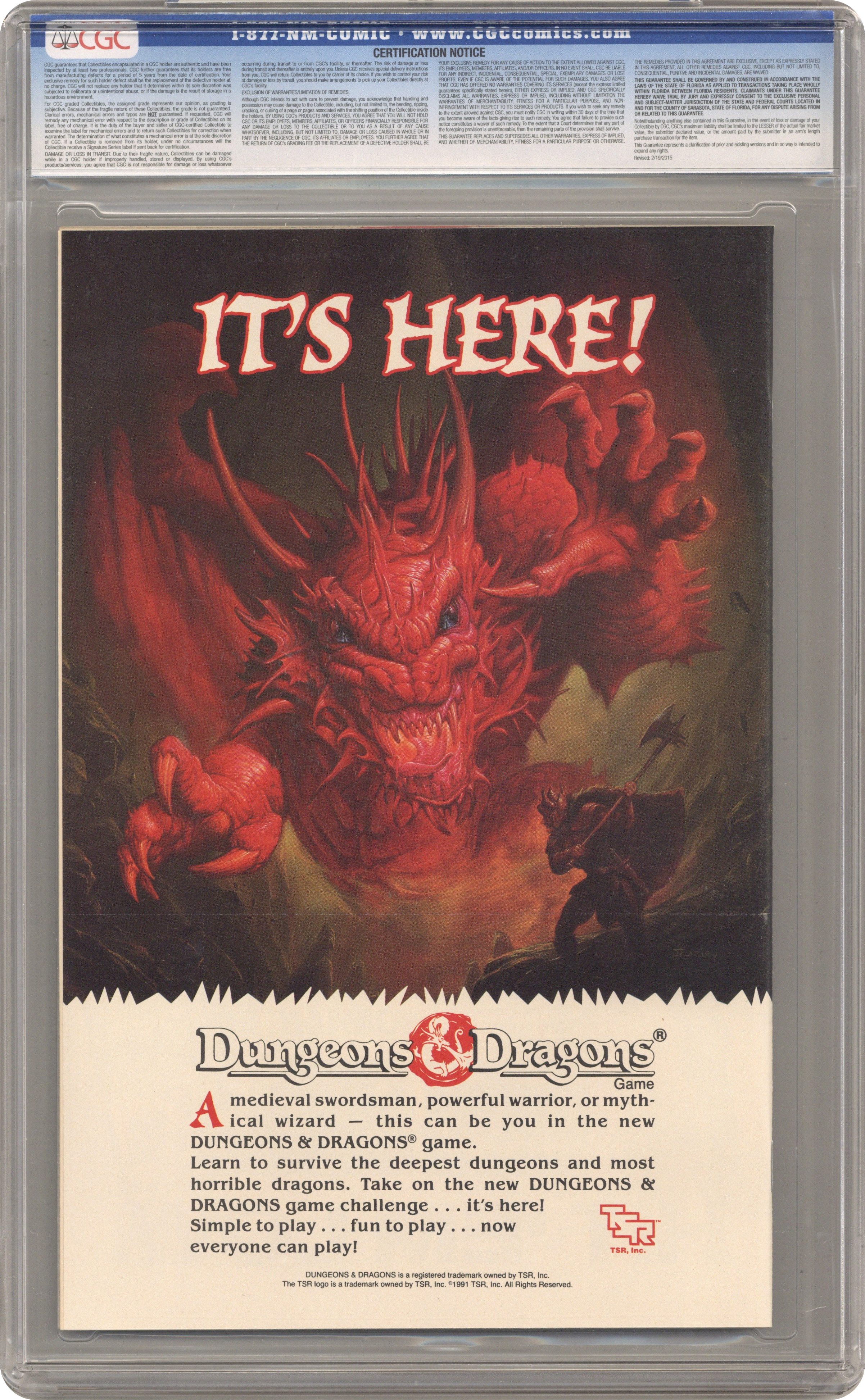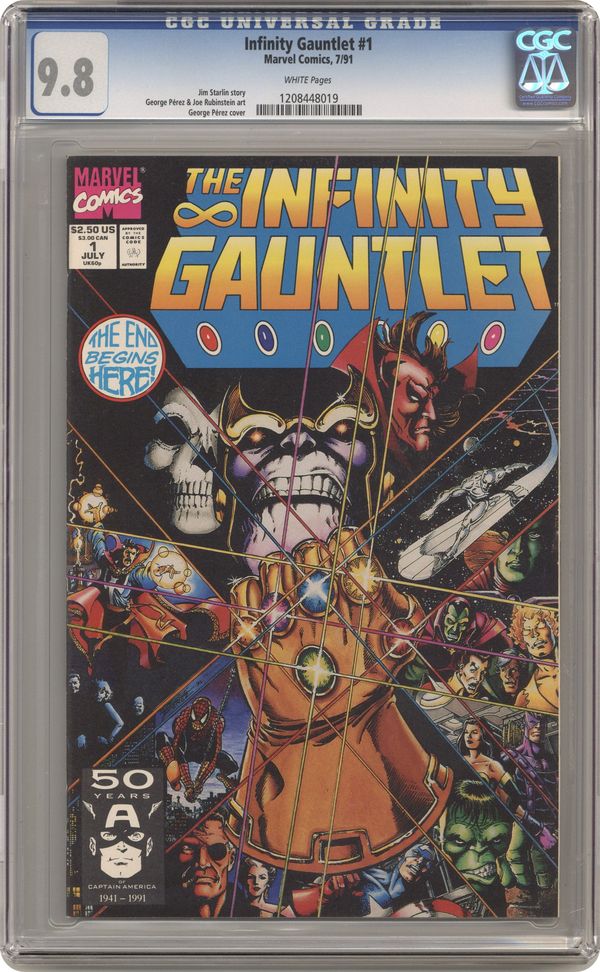 Direct Edition. Part 1 of 6. "God!" Story by Jim Starlin. Art by George Perez, Joe Rubinstein and Tom Christopher. Story continued from Thanos Quest #1-2 and Silver Surfer (1987-98 2nd Series) #50. The Silver Surfer crashes to earth and into the Sanctum Sanctorum of one Doctor Strange. The Sentinel of the Spaceways, barely alive after a grueling ordeal, arrives with the warning that the mad Titan, Thanos, has achieved ultimate power. Combining the Infinity Gems into the ominous Infinity Gauntlet, Thanos has become master of the mind, space, time, power, reality and the soul. And with his first act of nigh-omnipotent power Thanos eradicates half the population in the universe. Can the surviving heroes of Earth mount an offensive against this supreme power for evil and destruction, plus who are the mysterious new players who've just arrived on the scene? Cover price $2.50. Grade: CGC 9.8 explanation of grade Condition: Used (collectible)