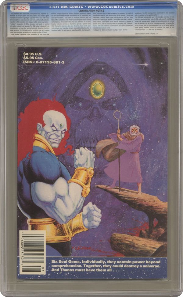 Ended Feb 6 2024 Winning Bid $84 1st Printing. "Schemes and Dreams!" Written by Jim Starlin. Art by Ron Lim John Beatty. Six Soul Gems. NOTE: This tale picks up after the events of Silver Surfer (1987 2nd Series) #38. Thanos the Mad Titan has been resurrected by the entity known as Death. Resurrected and given a dark mission. In order to accomplish this mission, Thanos will seek ultimate power - the Soul Gems! Individually, they contain power beyond comprehension. Together, they could destroy a universe. And Thanos must have them all.… Featuring the Elders of the Universe Champion and Gardiner, and the nefarious In-Betweener. 48 pages, FC Cover price $4.95. Grade: CGC 9.8 explanation of grade Condition: Used (collectible)