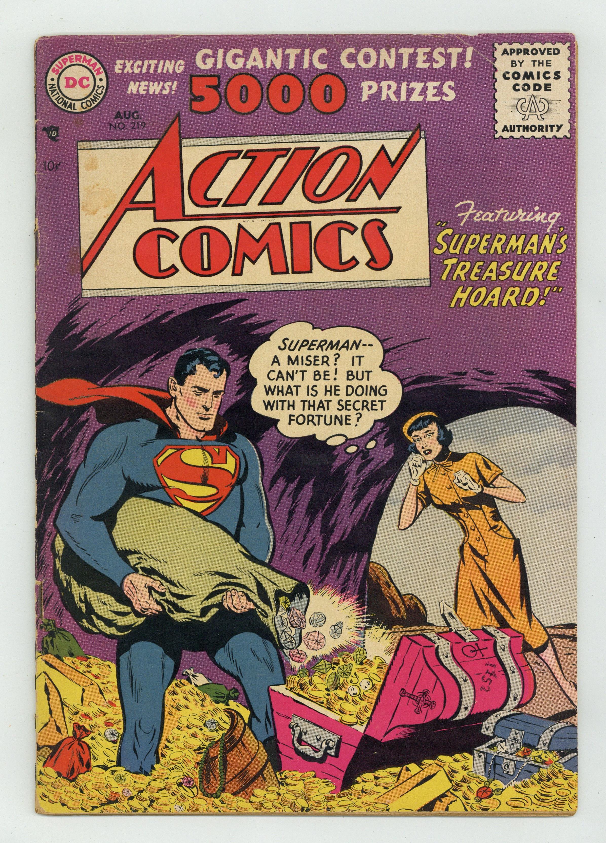 Cover pencils by Wayne Boring, inks by Stan Kaye. "Superman's Treasure Hoard," script by Bill Finger, pencils by Wayne Boring, inks by Stan Kaye; Superman is accumulating incredible wealth in a cavern of his own making, but no one seems to know the reason why. "The Amazing Army of Apes," script by Jack Miller, art by Ed Smalle; A military officer appears to go crazy and starts to think apes are his soldiers. 3/4–page Shorty story by Henry Boltinoff. "The Day I Beat the Baseball Jinx," script by Jack Miller (as Jack Mason), art by Raymond Perry. "Tom Thumb Tommy Tomorrow," script by Otto Binder, art by Jim Mooney. 36 Pages, Full Color. $.10 Cover price $0.10. Grade: FR 1.0 explanation of grade Condition: Used (collectible)