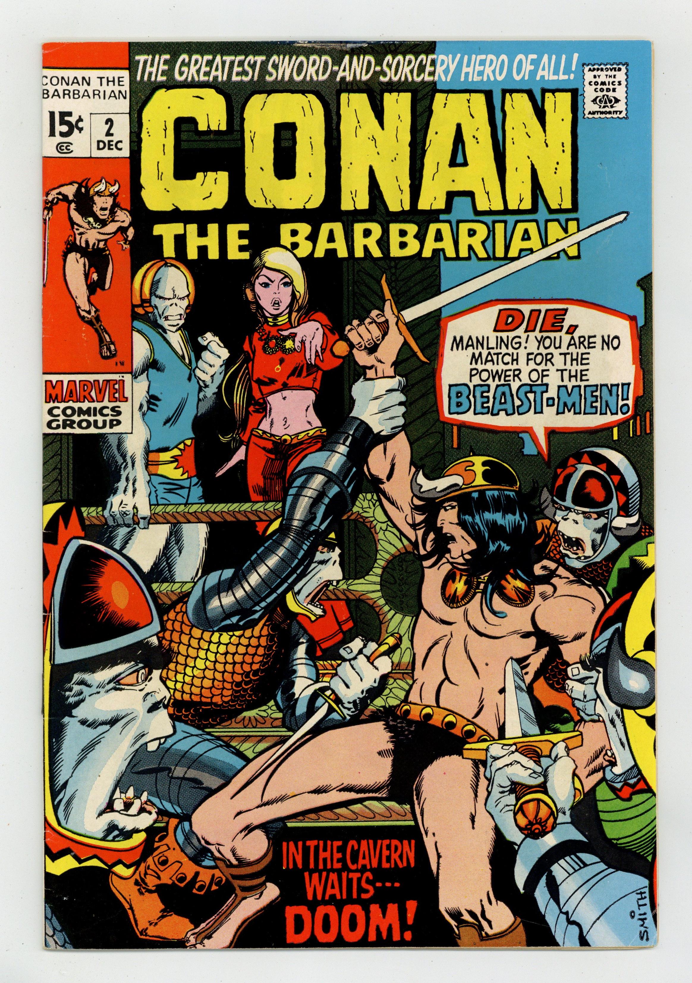 Cover art by Barry Windsor-Smith. Lair of the Beast-Men!, script by Roy Thomas, pencils by Barry Windsor-Smith, inks by Sal Buscema; Conan leads humans in a revolution against their ape-masters; Conan kills a snow-lion; Conan's 1st time in chains. Letters to the editor from writers Harlan Ellison, Dick Lupoff, August Derleth, and Ted White; comics historians Don and Maggie Thompson; and Glenn Lord. The letters page reprints the Hyborian Age map from Conan 1. 36 pgs. Cover price: $0.15. Cover price $0.15. Grade: FN+ 6.5 explanation of grade Condition: Used (collectible)