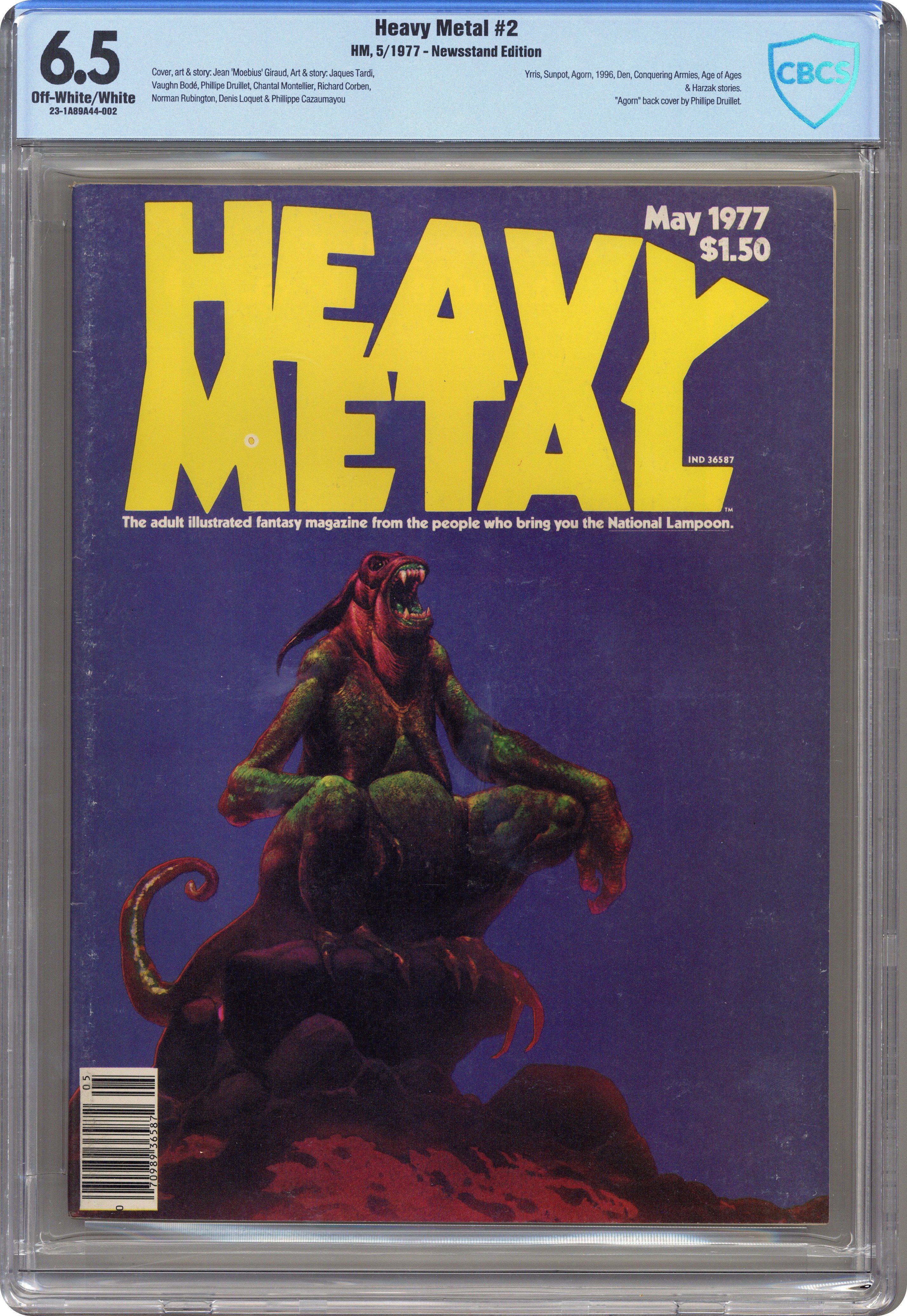 Ended Feb 16 2024 Winning Bid $22 Rich Corben, Moebius, & Bode art May 1977, issue 2. Dubbed "The adult illustrated fantasy magazine," Heavy Metal also publishes tales of horror, science fiction, and adventure. This second issue includes the following stories: MEAOBbIN MECRU by Tardi; The Adventures of Yriss by Druillet and Alexis; Sunpot by Vaughn Bodé; Agorn by Druillet; 1996 by Montellier; Den by Richard Corben; Age of Ages by Rubington; Conquering Armies by Dionnet and Gal; Roger by Locquet and Souchu; The Star-Death of Margaret Omali by James Tiptree Jr.; Virgo by Caza; Harzak by Moebius; and Festival by Picaret and Baret. Cover art by Moebius. Cover price $1.50. Grade: CBCS 6.5 explanation of grade Condition: Used (collectible)
