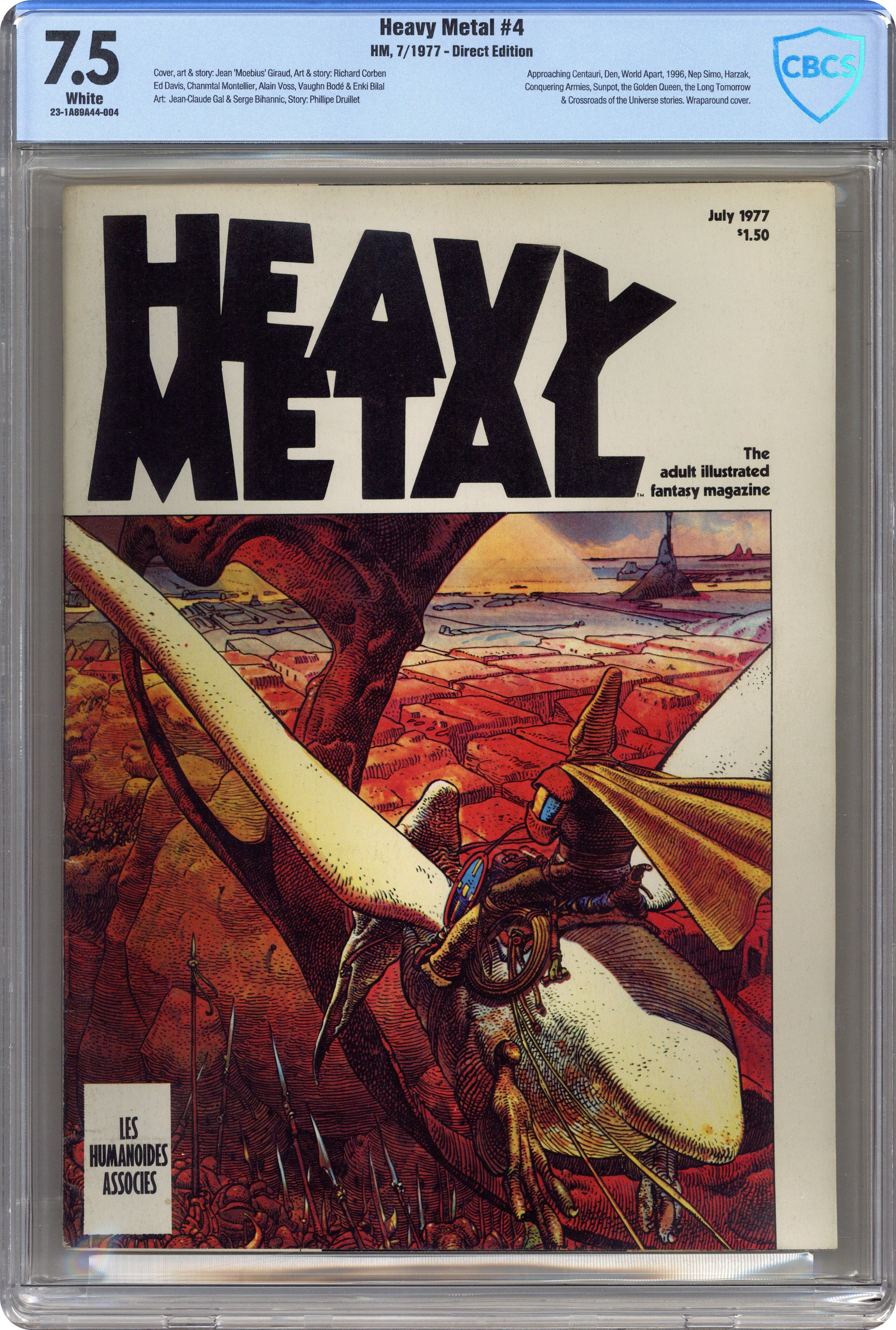 Rich Corben, Moebius, & Bode art July, 1977, issue 4. Dubbed "The adult illustrated fantasy magazine," Heavy Metal also publishes tales of horror, science fiction, and adventure. This fourth issue includes the following stories: Approaching Centauri by Druillet and Moebius; Den by Richard Corben; The Prince of Mist by Walter Perry; World Apart by Ed Davis; 1996 by Montellier; Nep Simo by Voss; Harzak by Moebius; Conquering Armies by Gal and Dionnet; Sunpot by Vaughn Bodé; The Golden Queen by Bihanic and Druillet; The Long Tomorrow by O'Bannon and Moebius; Crossroads of the Universe by Bilal; and Harzack by Moebius. Cover art by Moebius. Cover price $1.50. Grade: CBCS 7.5 explanation of grade Condition: Used (collectible)