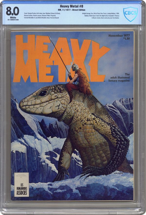 Rich Corben, Moebius, and Howard Chaykin art, eighth issue. Dubbed "The adult illustrated fantasy magazine," Heavy Metal also publishes tales of horror, science fiction, and adventure. This eighth issue includes the following stories: The Airtight Garage by Jerry C. by Moebius; Den by Richard Corben; The Bird of Dust by Bazolli and Caza; A Visit to Jivaskilla Technexpo by Lesueur; The Blue Terror by Zha and Claveloux; The Feet upon the Stomach by F'Murr; Ballade by Moebius; 1996 by Montellier; World Apart by Ed Davis; How's the Night Life on Cissalda by Harlan Ellison; Polonius by Picaret and Tardi; and Master by Nicollet. Includes a letter by Robert Silverberg. Cover by George Proctor. Cover price $1.50. Grade: CBCS 8.0 explanation of grade Condition: Used (collectible)