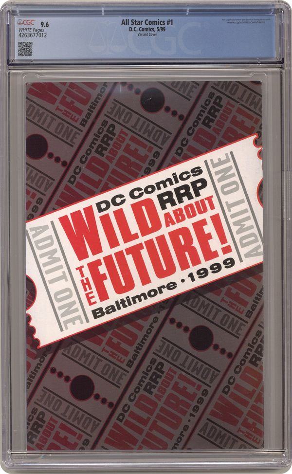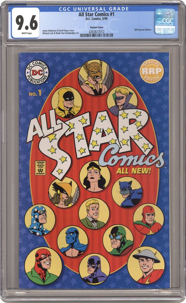 Golden Age Justice Society story by James Robinson and David Goyer with art by Michael Lark. Variant edition, no cover price, blank inside front and back covers, May 1999 dated Retailer Representative Edition (RRP). Grade: CGC 9.6 explanation of grade Condition: Used (collectible)