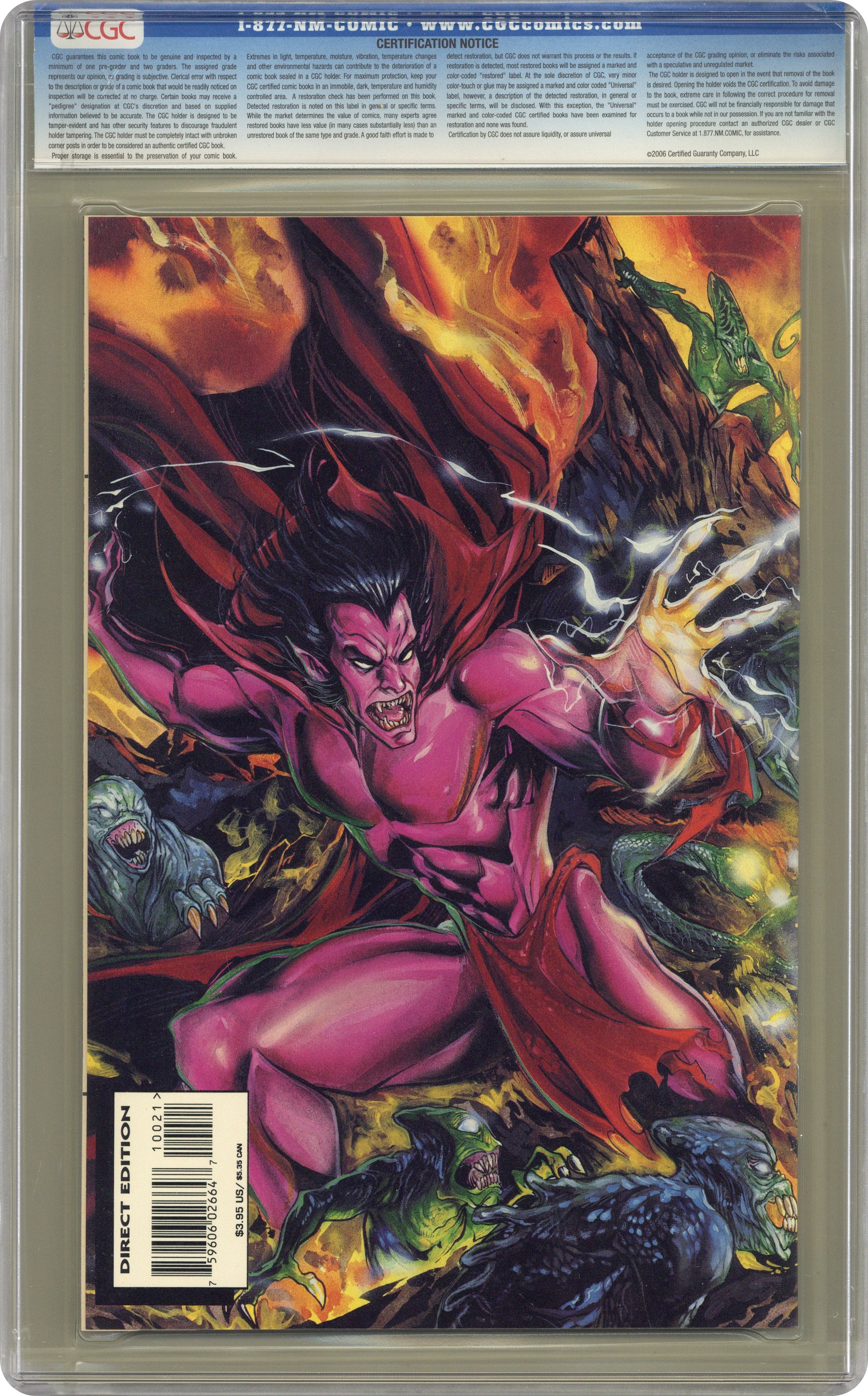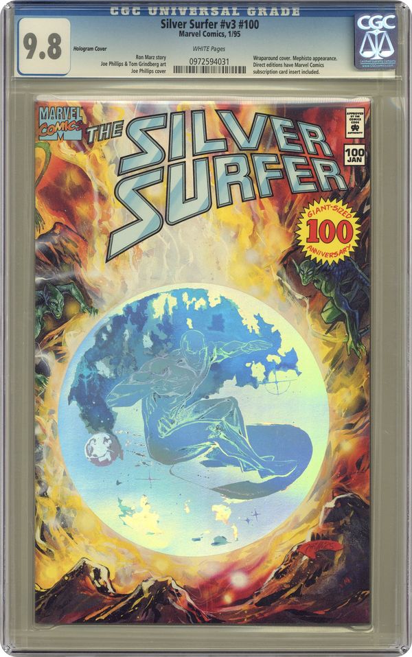 Hologram Direct Edition. Temptation. Part 4 of 4. Giant-Sized 100th Issue Anniversary. Story by Ron Marz. Art by Joe Phillips, Tom Grindberg, Tom Christopher, Don Hudson, and Bob Almond. The worse possible thing has happened. The Silver Surfer's soul is in the possession of one of his oldest and deadliest enemies. Norrin Radd will have to go to hell and back and face the devil himself. Can the Surfer regain that which was taken from him, or will Mephisto finally have the last laugh? 48 pages. Cover price $3.95. Grade: CGC 9.8 explanation of grade Condition: Used (collectible)