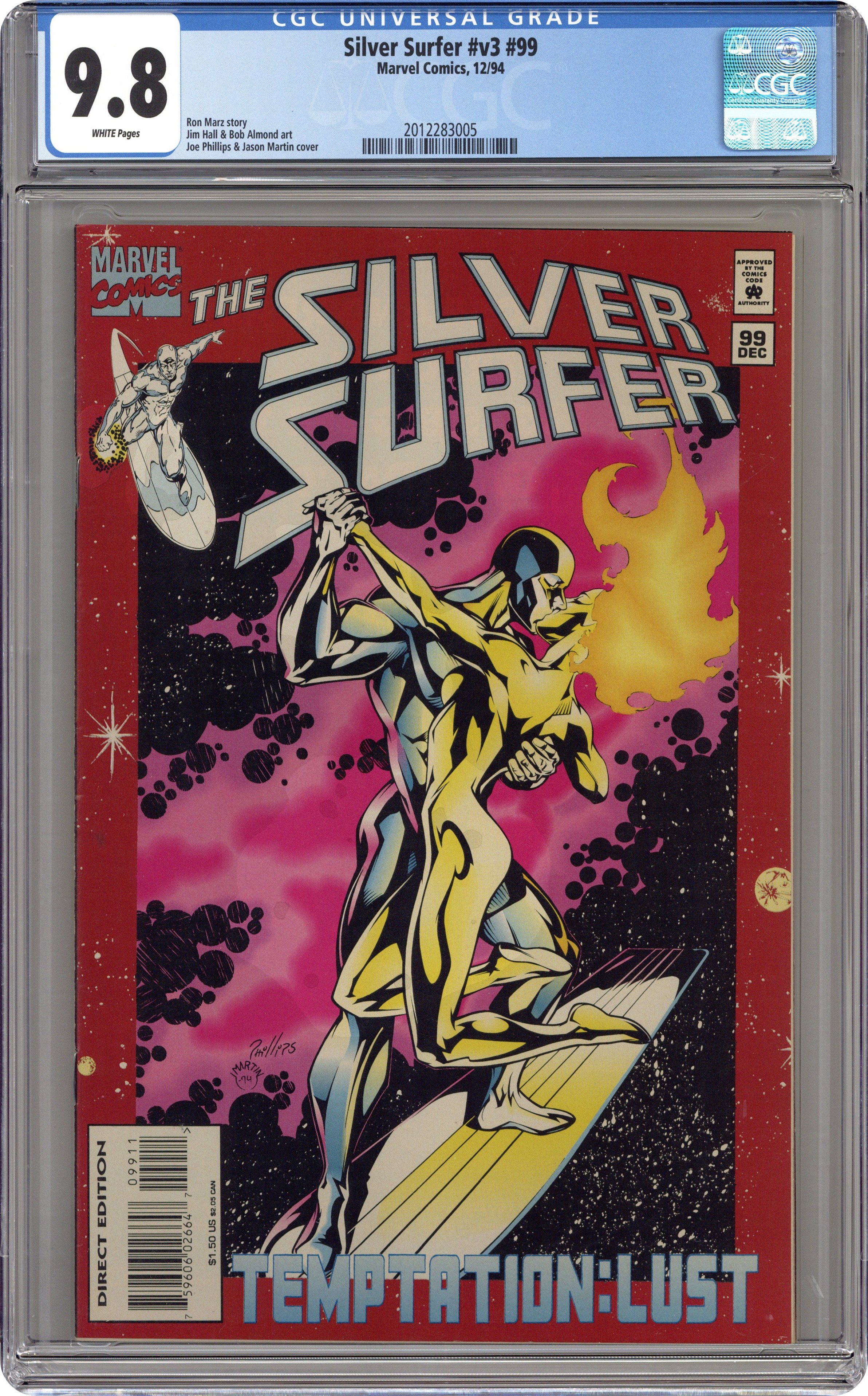 Temptation: Lust. Part 3 of 4. Guest-starring Nova. Story by Ron Marz. Art by Jim Hall and Bob Almond. Nova is back and the Silver Surfer is ready to give himself to her mind, body, and SOUL. Plus, the most shocking ending that will change the Surfer's life forever. 32 pages. Cover price $1.50. Grade: CGC 9.8 explanation of grade Condition: Used (collectible)