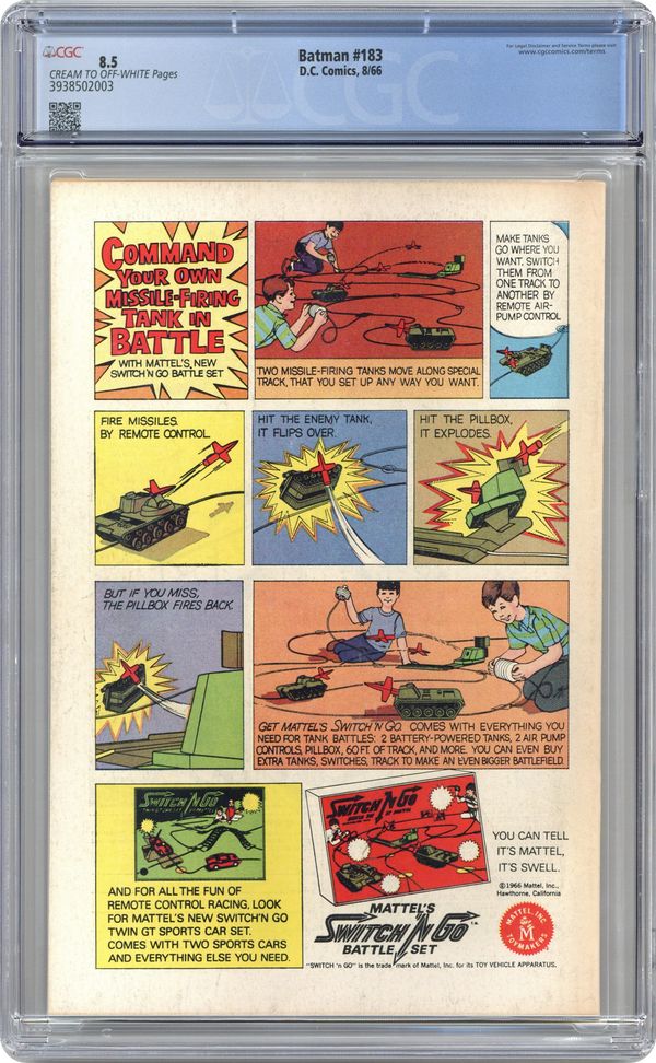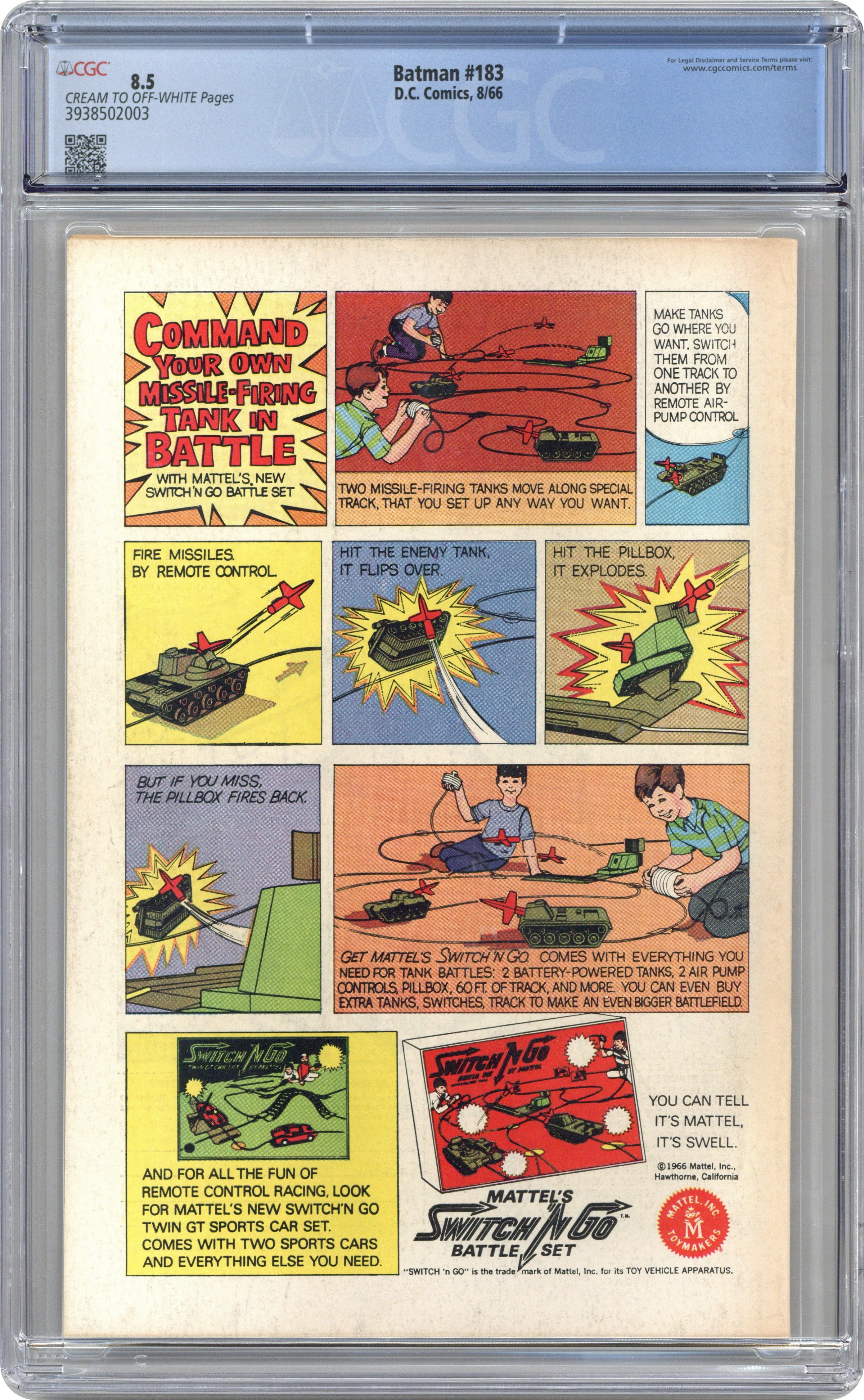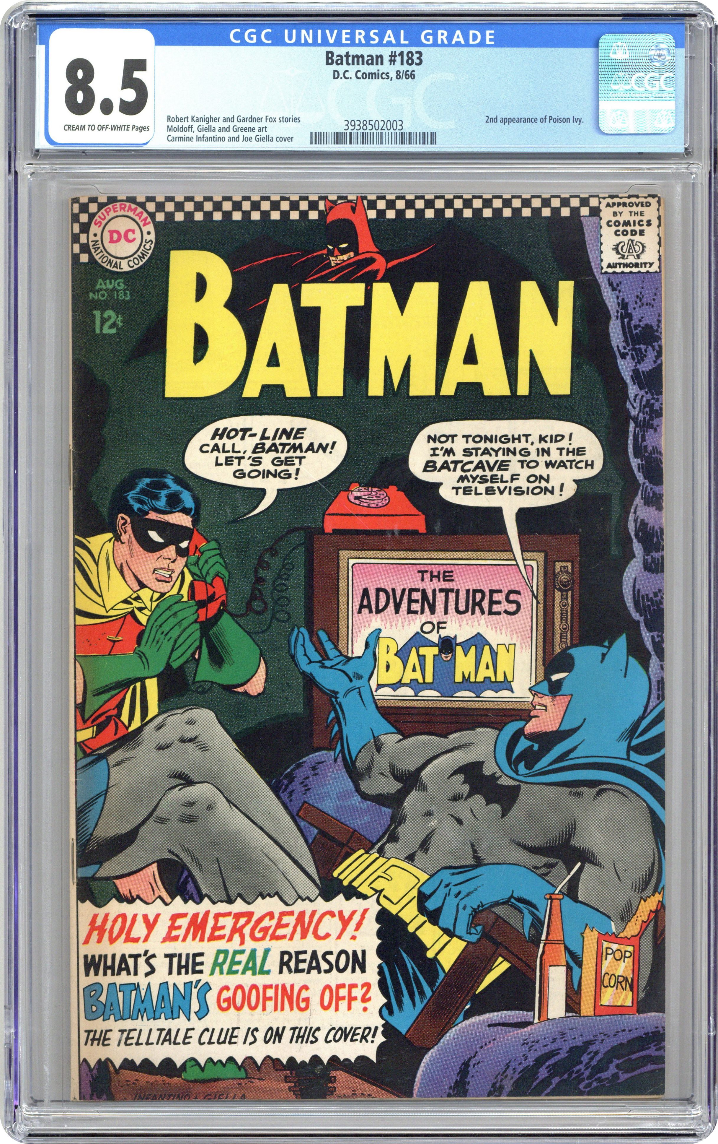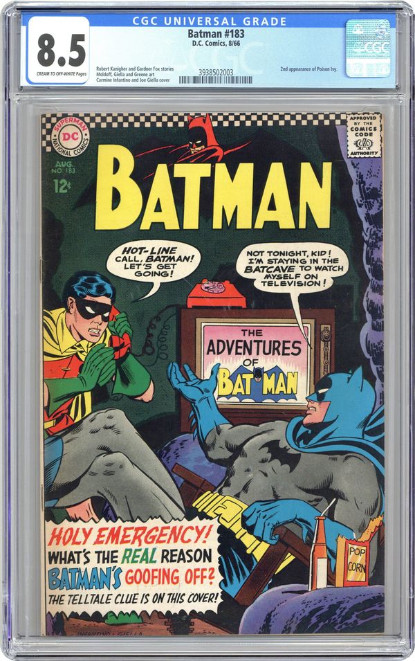 Ended Jan 21 2024 Winning Bid $180 Cover pencils by Carmine Infantino, inks by Joe Giella. "A Touch of Poison Ivy!", script by Robert Kanigher, pencils by Sheldon Moldoff (as Bob Kane), inks by Joe Giella; Missing the imprisoned Poison Ivy, the Caped Crusader receives a gift from her and she promises to repent; Batman visits her, but he is placed under her spell, and she uses him to make good her escape. Cap's Hobby Hints activity half-page by Henry Boltinoff. The Policeman Is Your Friend! public service announcement, script by Jack Schiff, art by Sheldon Moldoff. Letter from future comics writer Mike Friedrich. "Batman's Baffling Turnabout!", script by Gardner Fox, pencils by Sheldon Moldoff (as Bob Kane), inks by Joe Giella; While chasing crooks into a warehouse, Batman falls through a trapdoor and is captured while one of the crooks impersonates the Caped Crusader; A tell-tale clue alerts Robin that this is an imposter and he deals appropriately with the situation to find the real crime fighter. Letters to the editor from Biljo White, Irene Vartanoff, and comics writer Mike Friedrich. Statement of ownership--average print run 694,000; average paid circulation 453,745. 36 Pages, Full Color. Cover price $0.12. Grade: CGC 8.5 explanation of grade Condition: Used (collectible)