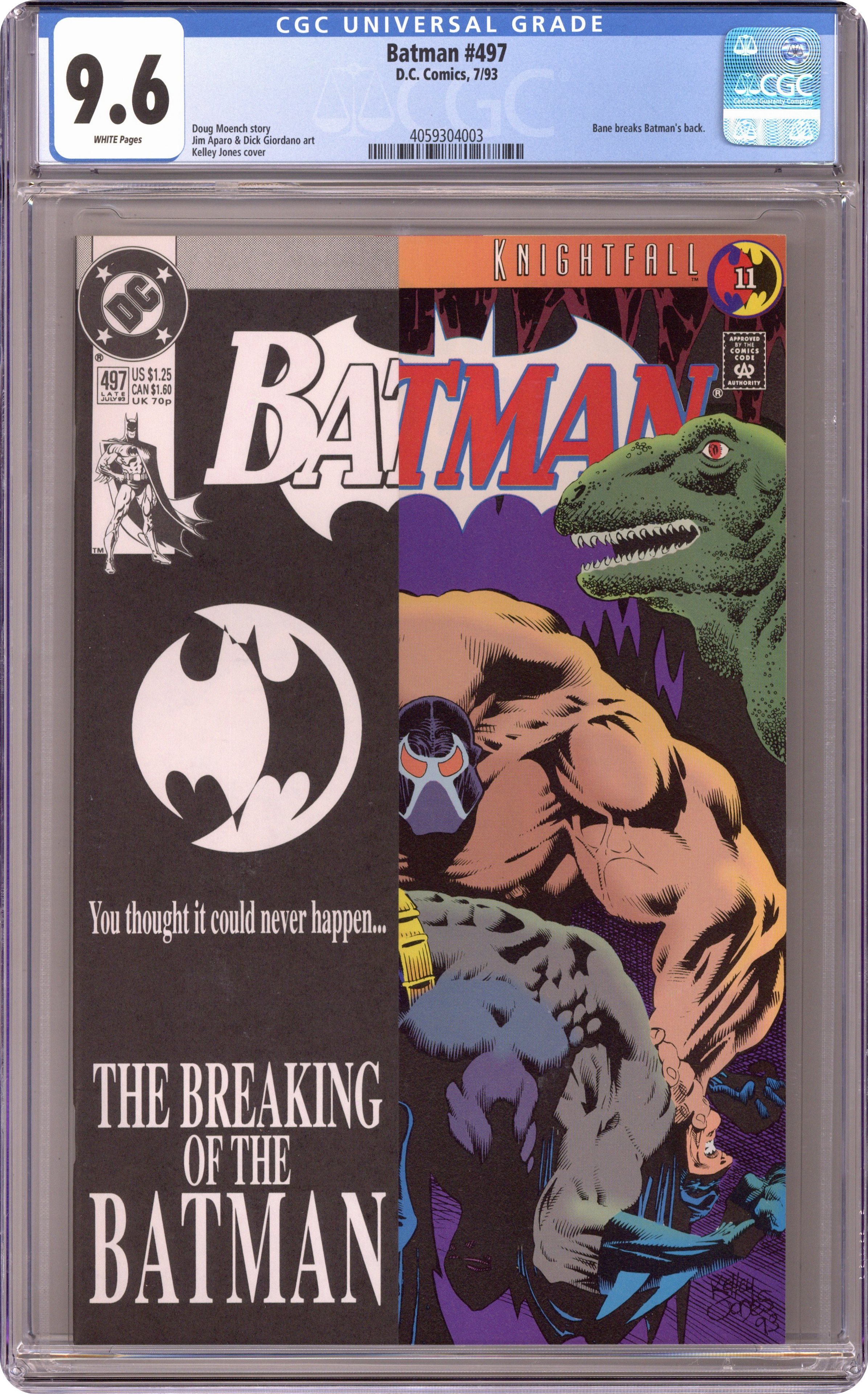 Ended Oct 15 2023 Winning Bid $42 Direct Edition with Overlay cover. Bane breaks Batman's back in Batman KnightFall Part 11. Home turf does not prove an advantage when Bane breaks Batman's back in the Batcave in "The Broken Bat." KnightFall continues in Detective Comics (1937- ) #664. Written by Doug Moench. Pencils by Jim Aparo. Inks by Dick Giordano. Cover by Kelley Jones. 36 Pages, Full Color. Cover price $1.25. Grade: CGC 9.6 explanation of grade Condition: Used (collectible)
