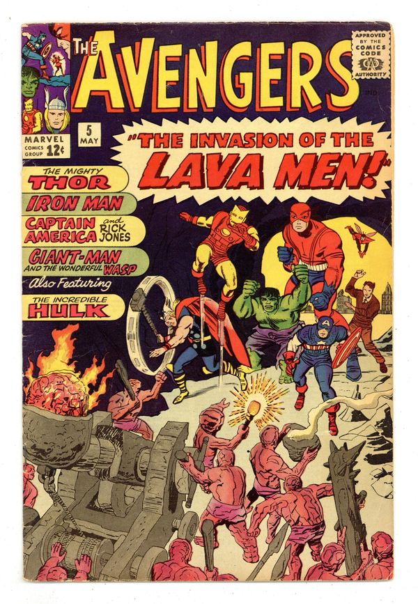 Ended Oct 24 2023 Winning Bid $118 Cover pencils by Jack Kirby, inks by Vince Colletta. "The Invasion of the Lava Men!", script by Stan Lee, pencils by Jack Kirby, inks by Paul Reinman; The Avengers return to their mansion to inspect the damage caused by the battle with the Hulk; Days later, a mysterious high-pitched sound destroys a computer in one of Tony Stark's factories in Long Island and Iron Man is informed; Meanwhile, Giant-Man and the Wasp are conducting experiments inside of a large anthill; They are also affected by the noise and manage to escape before the anthill collapses; In his medical office, Don Blake reads about the effects of the noise in the newspaper; Thor meets up with Captain America and Rick Jones, who are training, and they witness another shockwave; The six heroes investigate the source of this new unknown threat; Meanwhile, in an army base in the west of the country, a strange rock breaks the surface of the earth, and soldiers investigate. Roster includes: Captain America, Thor, Iron Man, Wasp, and Giant-Man. Appearance by the Hulk. First letters page; letter to the editor from comics artist Alan Weiss. 36 pgs., full color. $0.12. Cover price $0.12. Grade: VG 4.0 explanation of grade Condition: Used (collectible)
