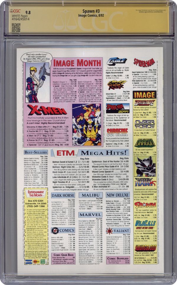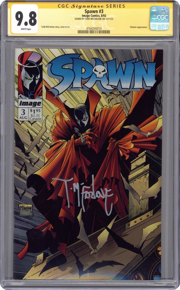 Direct Edition (has no bar code on cover) - "Questions!" Part 3 of 4. Created, story, and art by Todd McFarlane. Spawn finally confronts his wife, five years after his death. Plus, can this newly born Spawn survive a battle with a true denizen from the Underworld? It's Spawn vs. the Violator in a battle neither of them may walk away from completely intact. Cover price $1.95. Grade: CGC 9.8 explanation of grade Condition: Used (collectible)
