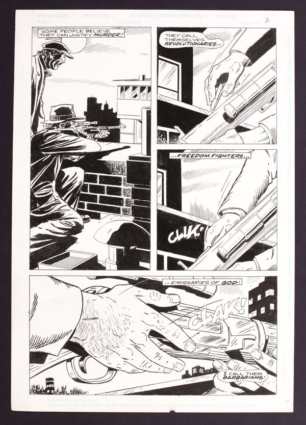 This page appears to be unpublished and the artist is unknown. It is noted as Page 2 of whatever story it would have been part of. Pencil and ink on DC Comics art board. 11 1/2" x 16 1/2", B&W.