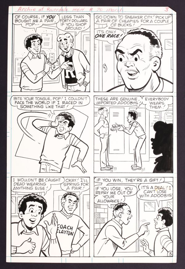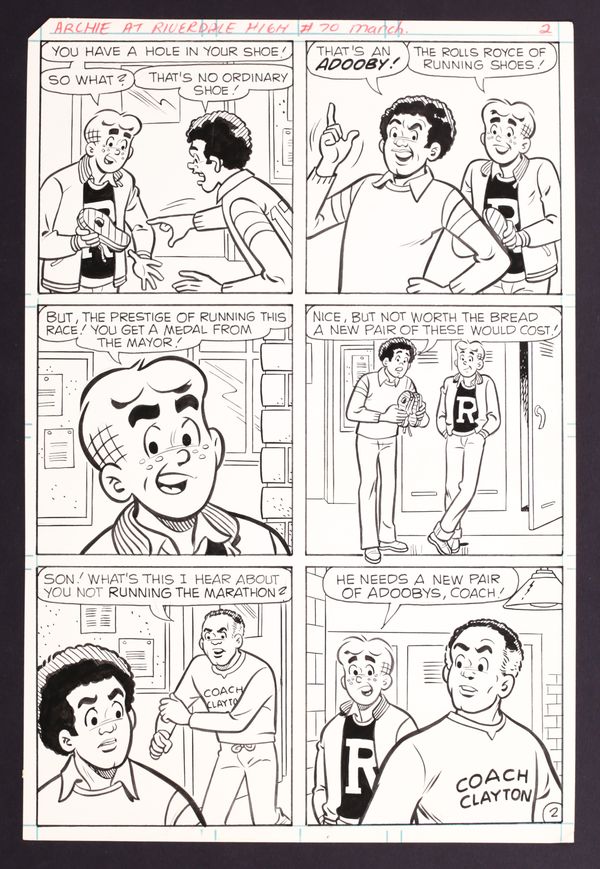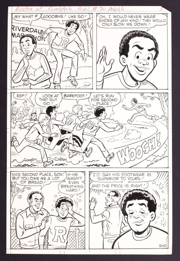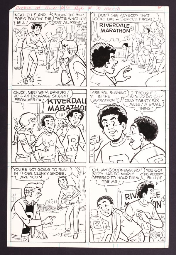 Artist(s) uncredited. An unexpected twist punctuates this charming tale about Archie trying to help Chuck overcome a footwear foible in order to win the Riverdale Marathon! Pencil and ink on 5 sheets of comic art board, each measuring 10 1/2" x 15 3/4". Note: The bottom two panels of the first page are added in with tape on the reverse.