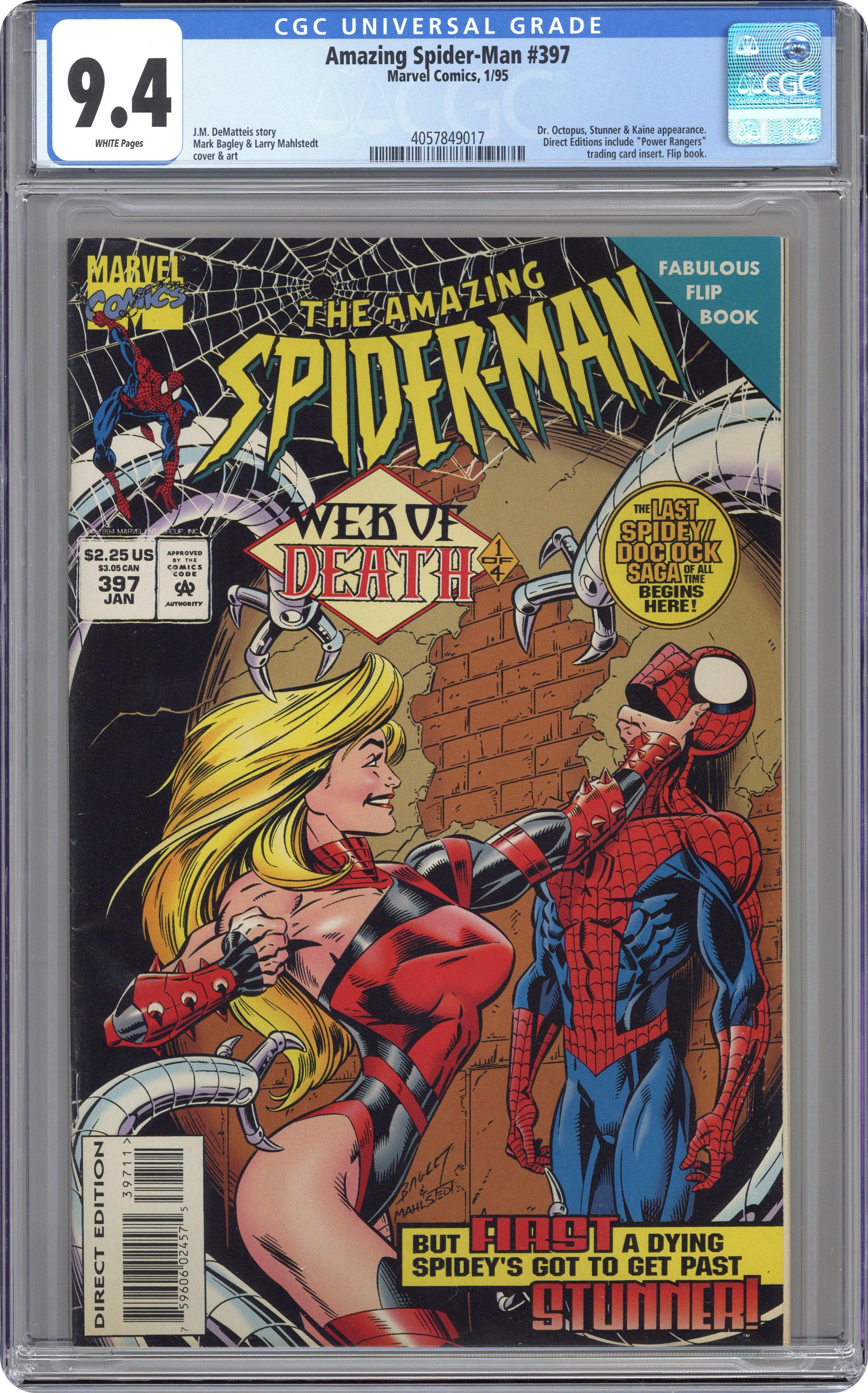 Ended Oct 24 2023 Winning Bid $29 48-page Flipbook Edition. "Tentacles." Web of Death, Part 1 of 4. Script by J.M. DeMatteis. Pencils by Mark Bagley. Inks by Larry Mahlstedt. Cover by Mark Bagley and Larry Mahlstedt. Peter Parker is dead (spider) man walking after the antidote failed to remove the Vulture's deadly virus from his body (at the end of Spectacular Spider-Man 219)! The web-slinger is fading fast with no help in sight! But in a truly bizarre twist of fate, one of Spider-Man's greatest enemies takes compassion on him! Is Doctor Octopus really going to step forward and save the wall-crawler's life? Sometimes six arms are better than two! In the meantime, Mary Jane returns to New York City after reconciling with her family. Story continues in Spectacular Spider-Man 220. First appearance of Stunner. Cameo appearances by Aunt May and Kaine. Flip story: "Radically Both." Story by Christopher Golden. Back cover by Tom Grummett. This 15-page abridged story (with clip art) is taken from the Ultimate Spider-Man (1994 Novel) anthology by Berkley Books. The short story features Spider-Man vs. the Lizard. (Notes: This issue was published with the Mighty Morphin Power Rangers White Ranger barcode card for Tiger game systems. The issue may or may not contain the card now.) 52 pages. Cover price $2.25. Grade: CGC 9.4 explanation of grade Condition: Used (collectible)