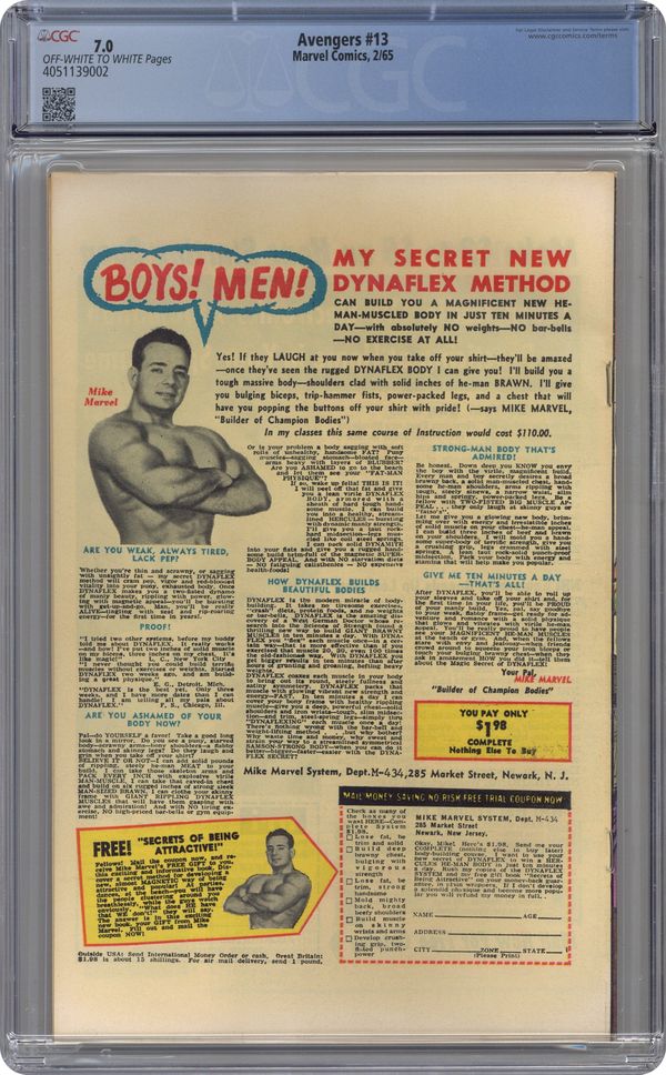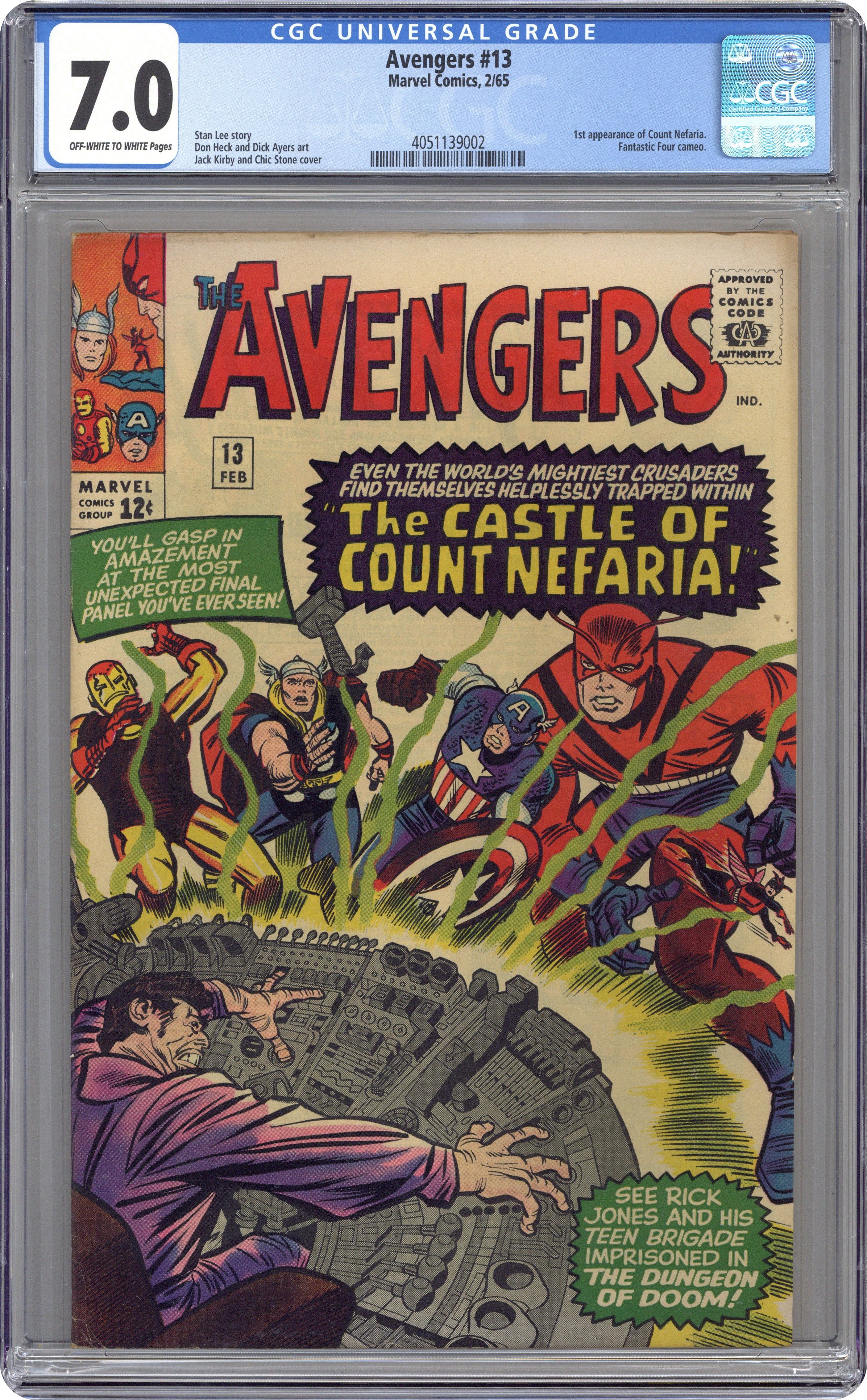 Ended Nov 21 2023 Winning Bid $107 Cover pencils by Jack Kirby, inks by Chic Stone. "Trapped in... The Castle of Count Nefaria!", script by Stan Lee, pencils by Don Heck, inks by Dick Ayers; When Count Nefaria, the head of the crime organization known as the Maggia, moves his European castle to New Jersey, he invites the Avengers to be his guests at the castle's opening day; However, he then creates duplicates of the Avengers who go to Washington DC to take over the government. Avengers Roll Call: Captain America, Thor, Iron Man, Wasp, Giant Man, and Rick Jones. First appearance of Count Nefaria and the Maggia. Guest appearance by the Fantastic Four. First appearance of the Avengers Emergency Headquarters. Reprinted in Marvel Triple Action #7. 36 pgs., full color. $0.12. Cover price $0.12. Grade: CGC 7.0 explanation of grade Condition: Used (collectible)