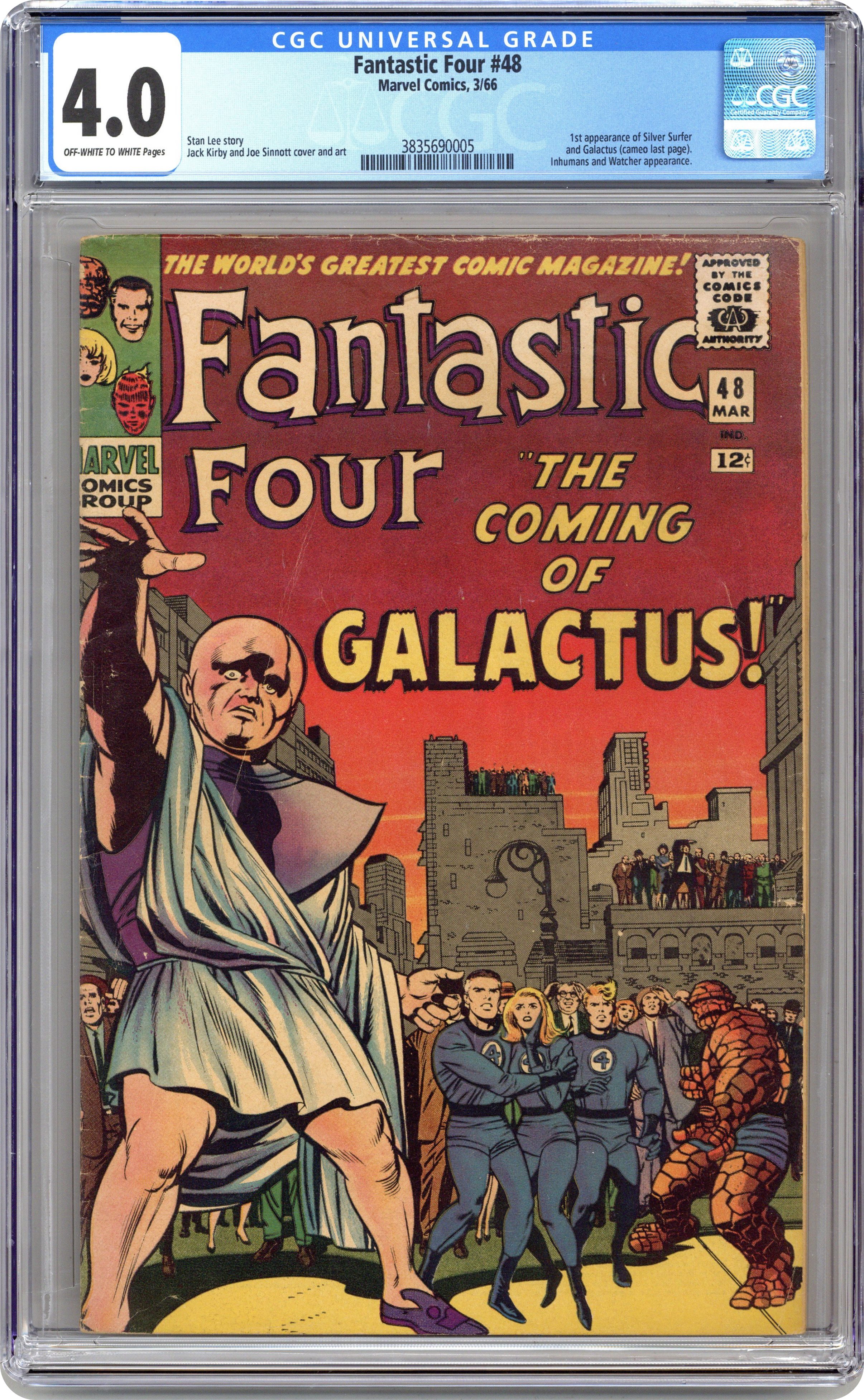 Ended Oct 10 2023 Winning Bid $1,050 Cover pencils by Jack Kirby, inks by Joe Sinnott. First appearance of Galactus and the Silver Surfer in one of the most famous stories of the Silver Age, The Coming of Galactus!, script by Stan Lee, pencils by Jack Kirby, inks by Joe Sinnott; Black Bolt and the Fantastic Four put an end to Maximus's plan to destroy all the humans; Once the Fantastic Four return to New York the Watcher tells them of the coming danger of Galactus. Letter to the editor from comics writer Don McGregor. 36 pages, full color. Cover price $0.12. Grade: CGC 4.0 explanation of grade Condition: Used (collectible)