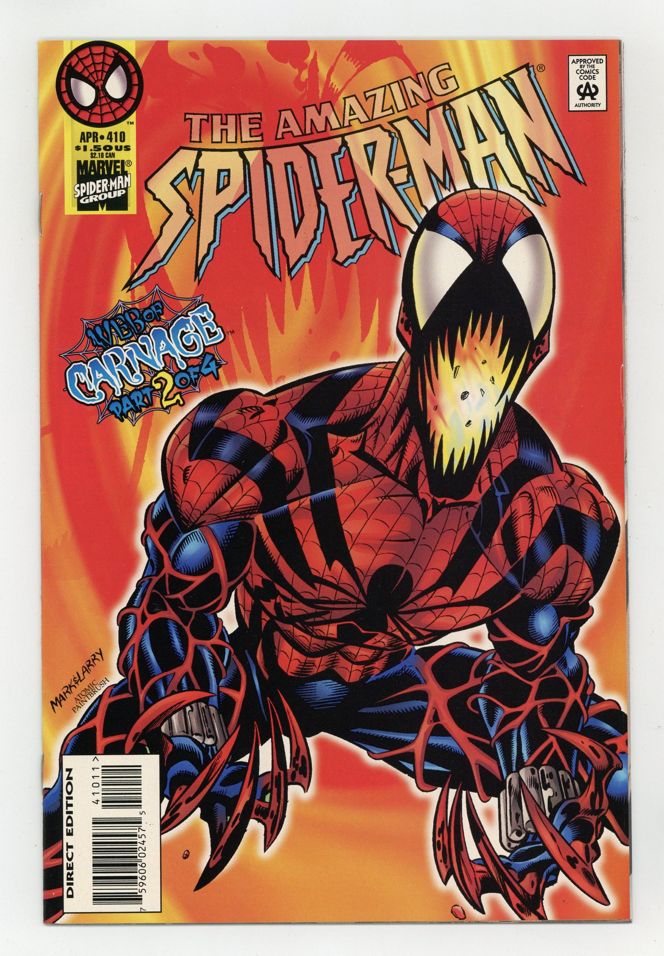 Direct Edition. Cover pencils by Mark Bagley, inks by Larry Mahlstedt. It's Carnage versus Spidey in Web of Carnage Part 2 of 4, "And Now - Spider-Carnage," script by Tom DeFalco, pencils by Mark Bagley, inks by Larry Malhstedt and Randy Emberlin; Spidey and Peter learn the Spider-skeleton is an actual Spider-Man clone and that Ben's girlfriend Jessica Carradine is the Burglar's daughter (SenSM #3, '96); Meanwhile, Carnage terrorizes the city even though Cletus Kasady is safe in his cell; Seeking answers, Spidey follows Ravencroft guard Dickerson to an underground super-villain-worshipping club where Dickerson sells Carnage memorabilia filched from Ravencroft; Carnage attacks the club, and battles Spidey, escaping after bringing down the roof; At the Daily Bugle, Jessica gets a job to photograph Spidey as a public menace; Spidey tails Ravencroft security chief John Jameson, discovering him possessed by the Carnage symbiote. The story continues from Sensational Spider-Man 3 and continues in Spider-Man 67. 36 pgs., full color. $1.50. Cover price $1.50. Grade: VF/NM 9.0 explanation of grade Condition: Used (collectible)