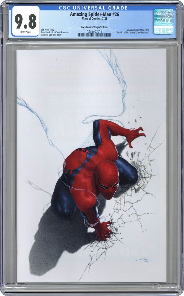 Ended Oct 14 2023 Winning Bid $1,625 Bry's Comics Exclusive Virgin Cover by Gabriele Dell'Otto - limited to 20 copies. Written by Zeb Wells. Art by John Romita Jr. Now fully in the present, the Emissary has returned and his power is so far beyond Spider-Man's abilities. The heroes may figure out a way to win, but the cost of victory will be so immense that you may hope they don't... 44 pages, full color. Rated T+ Grade: CGC 9.8 explanation of grade Condition: Used (collectible)